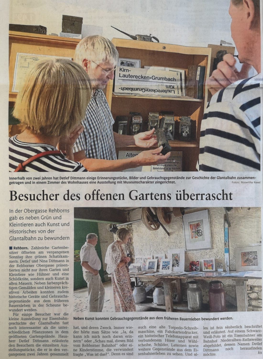 Im Museum Rehborn: - Die Glantalbahn -- Öffnungstermine 2025: 18. Mai (internationaler Museumstag), 8. Juni, 29. Juni (Tag der offenen Gartentüren), 20. Juli und 3. August. Die letzte Möglichkeit, die Aussstellung in historischem Ambiente zu erleben, ist der 31. August 2025. Außerhalb dieser Termine bieten wir bis zum 31. August Einzel- oder Gruppenführungen an. Kontaktieren Sie uns gerne unter ddbahnen@web.de. Neben dem Bahnmuseum kann auch das Bauernmuseum mit zahlreichen interessanten und kuriosen Geräten aus den letzten zwei Jahrhunderten besichtigt werden. Ab dem 01. September 2025 ist das Museum geschlossen.