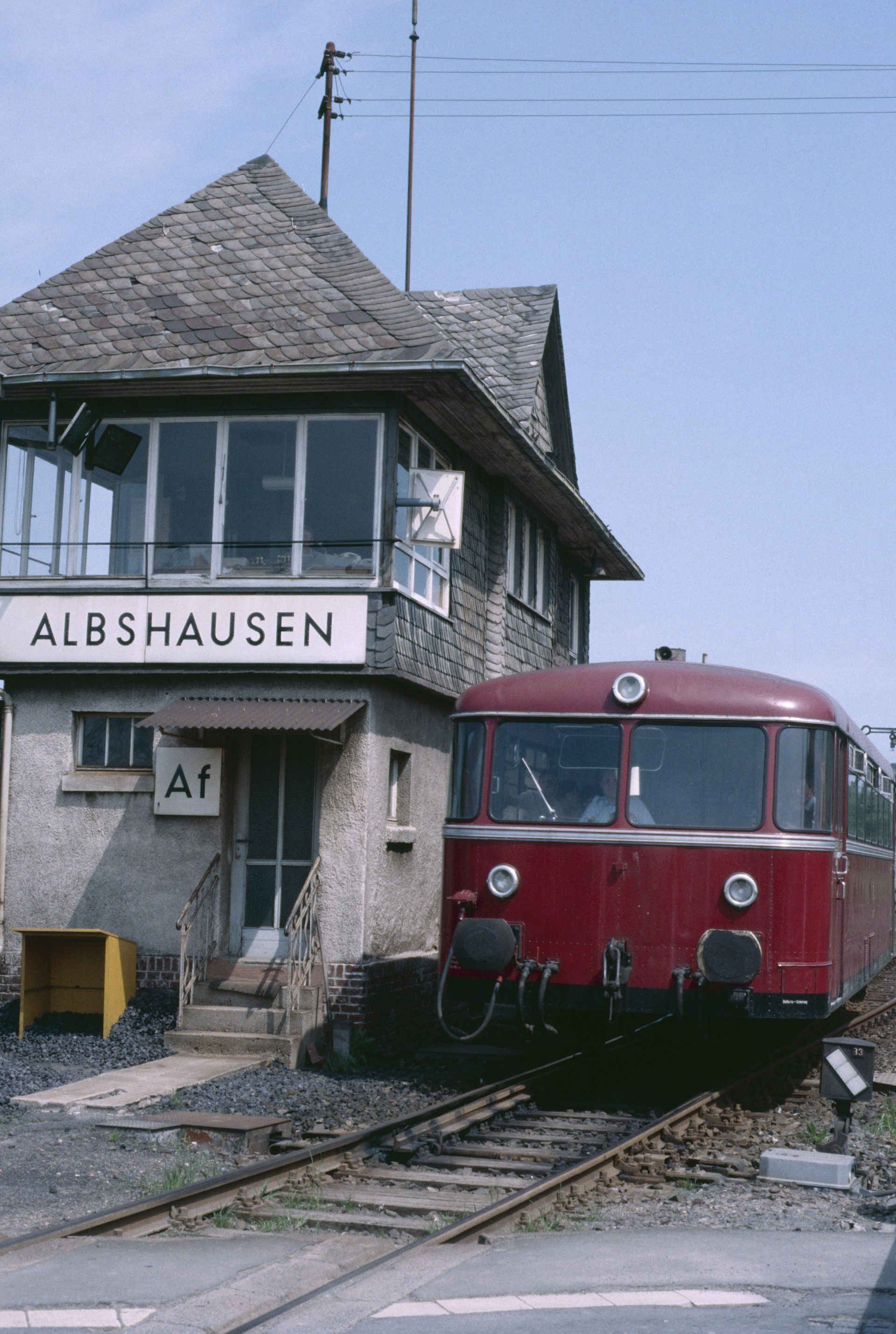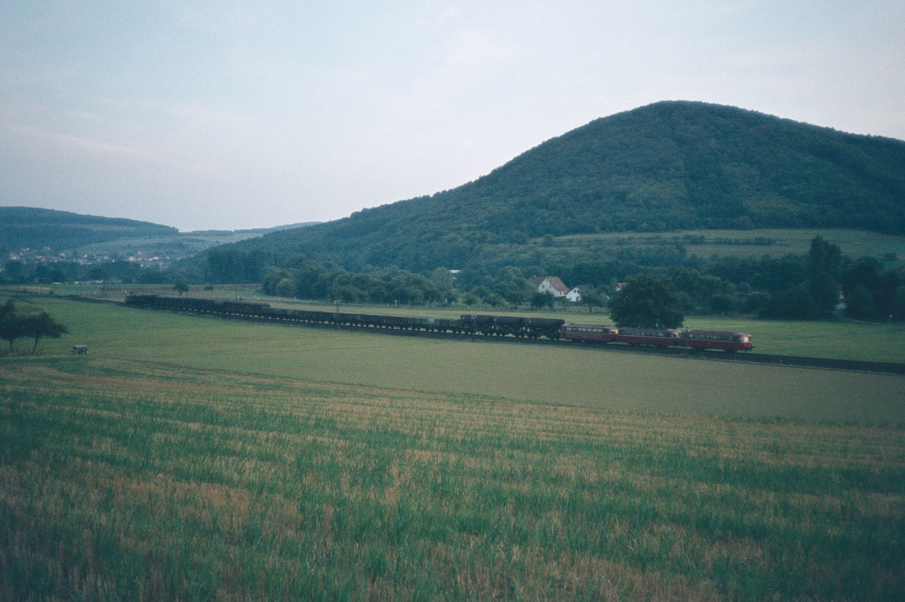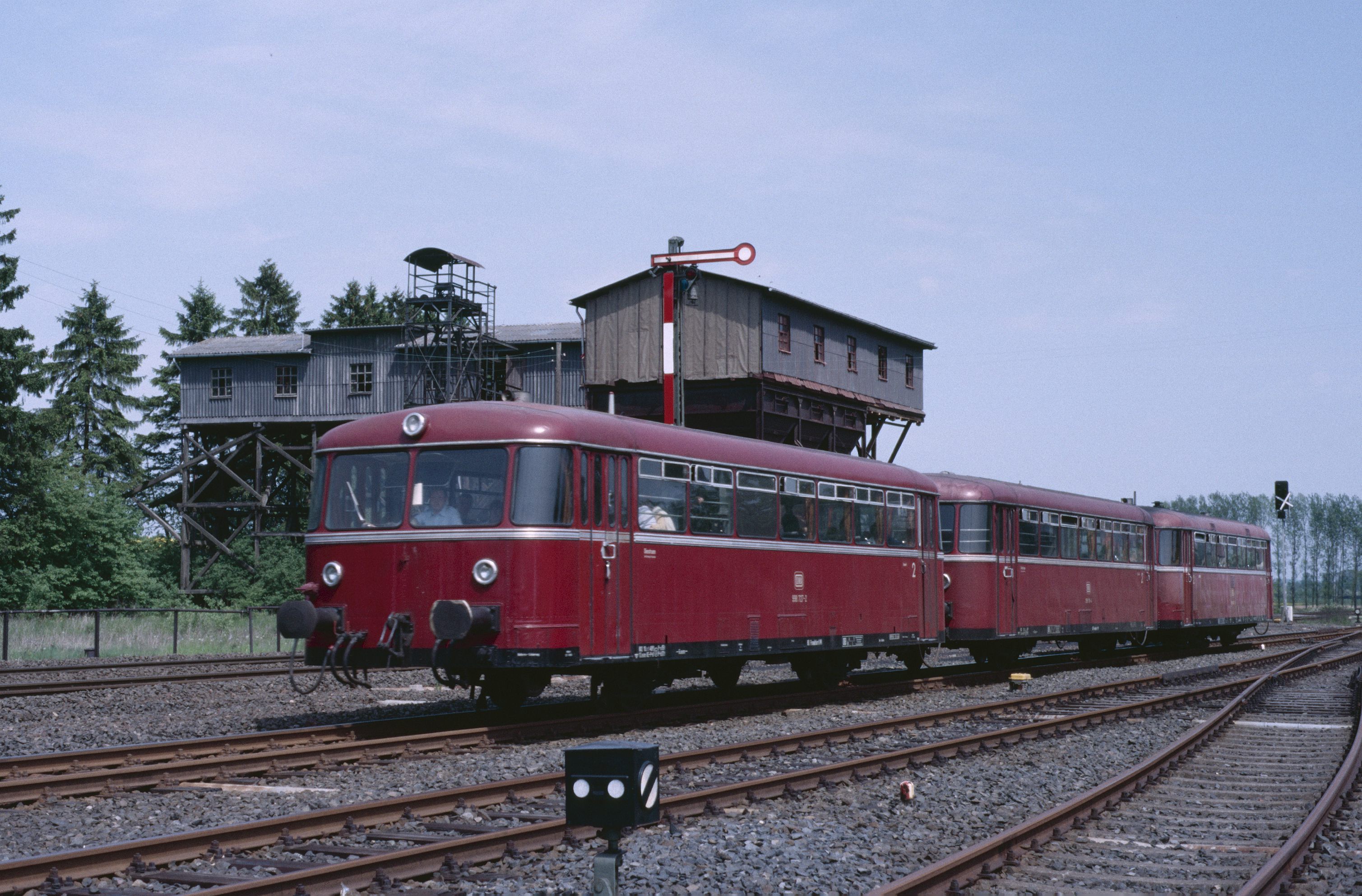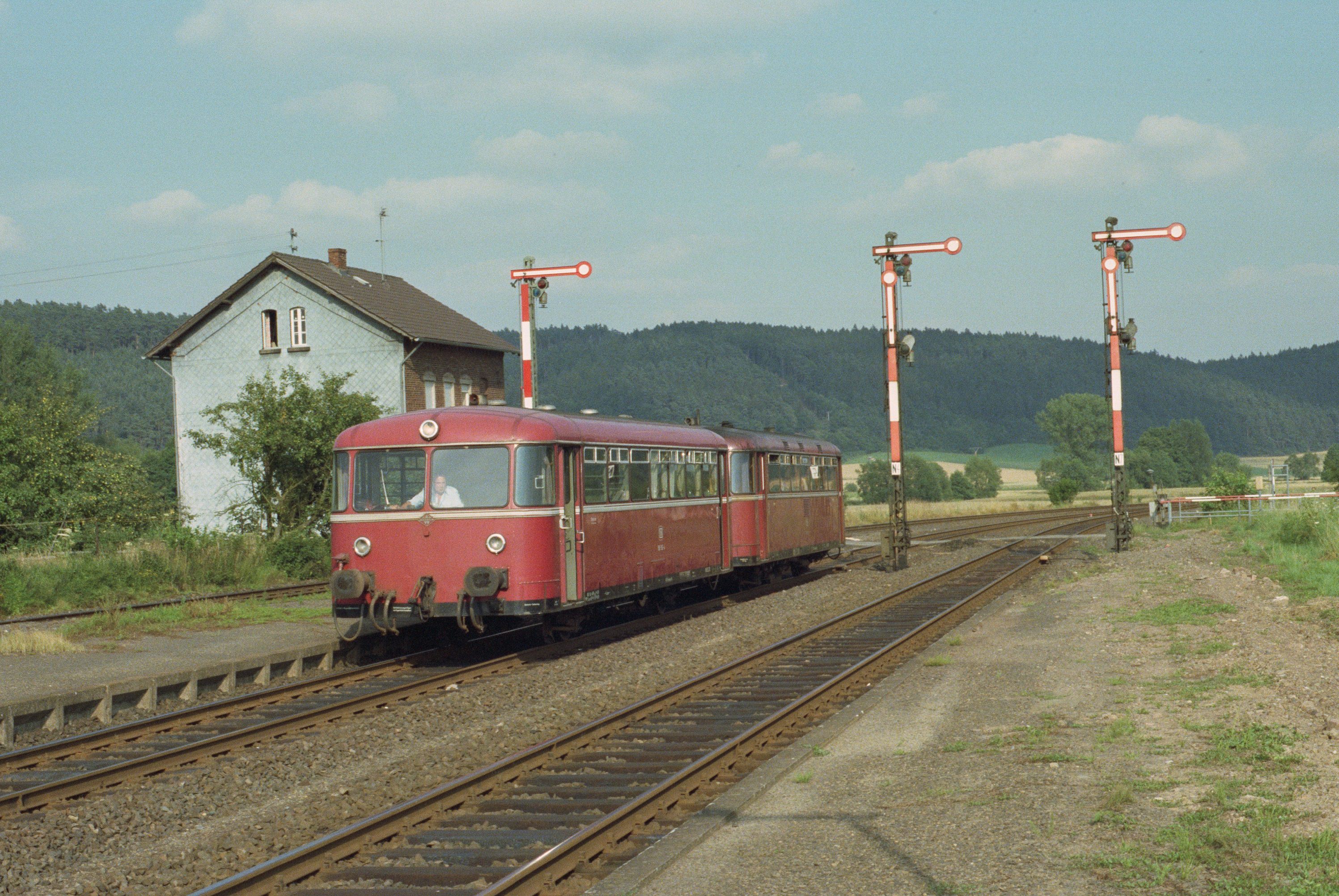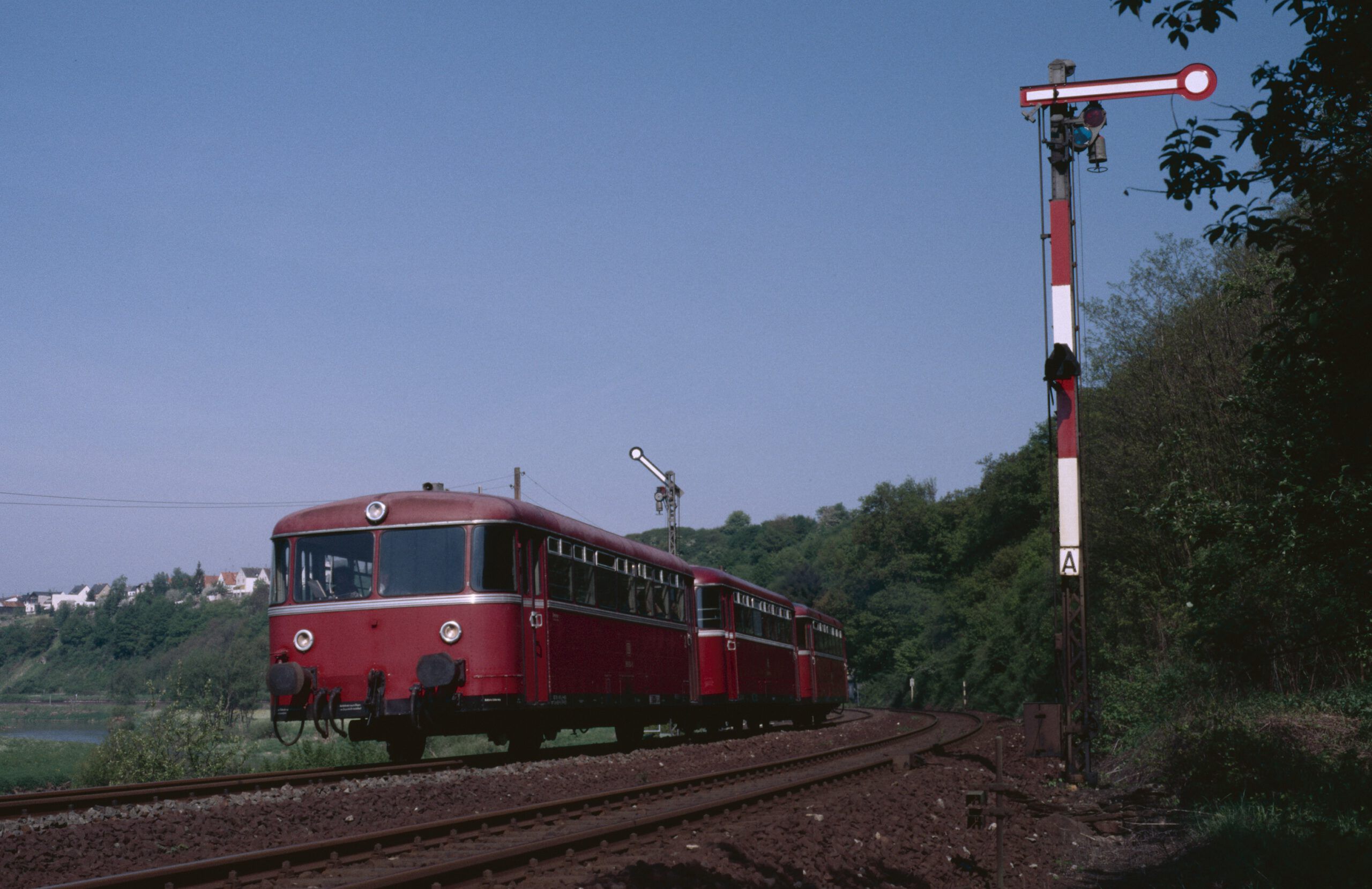 Im Lahntal waren in den 1980er Jahren recht häufig Wagenkästen alter Güterwaggons neben der Strecke aufgestellt. So auch dieser Wagenkasten vermutlich eines ehemaligen G 10-Güterwaggons neben dem Einfahr-Vorsignal von Laurenburg, an dem am 16. Mai 1988 diese dreiteilige Schienenbusgarnitur vorbei knattert