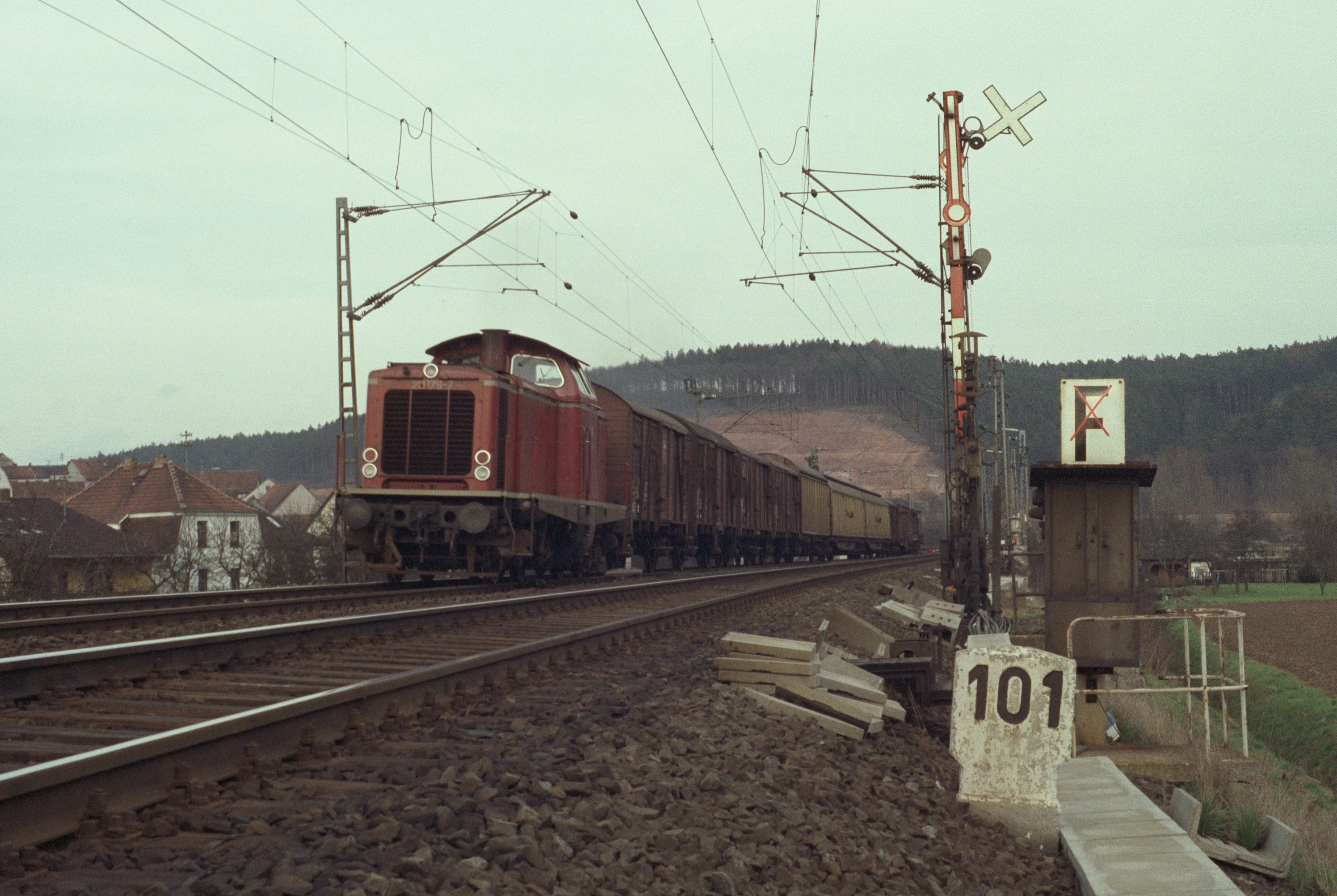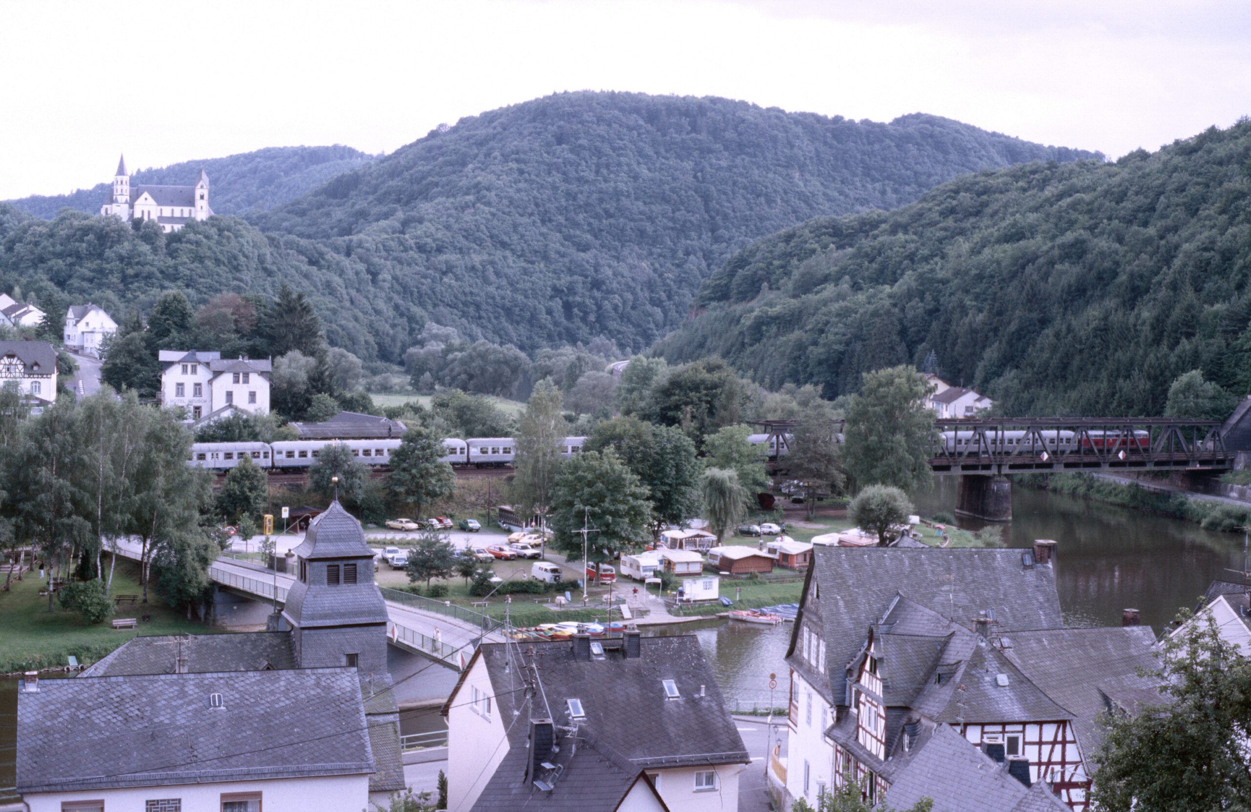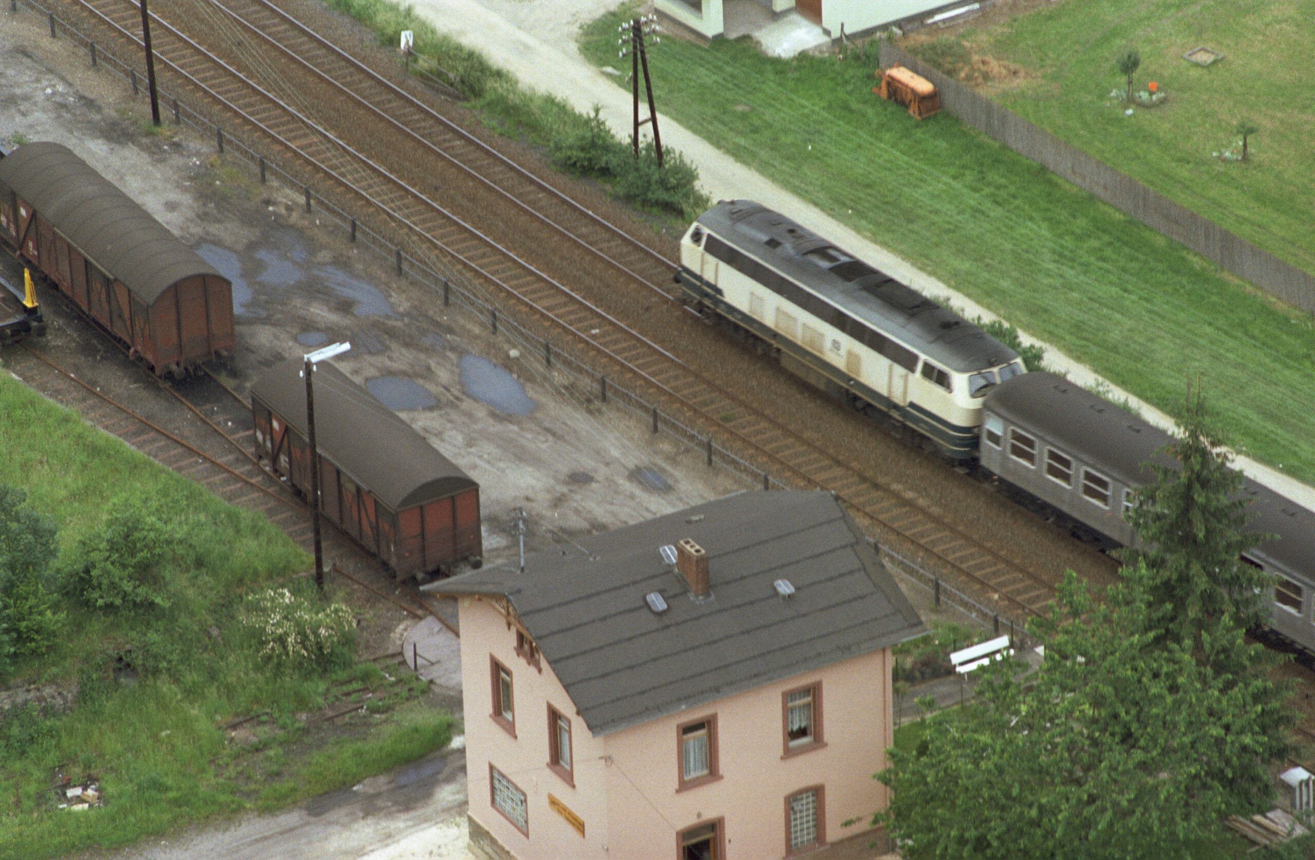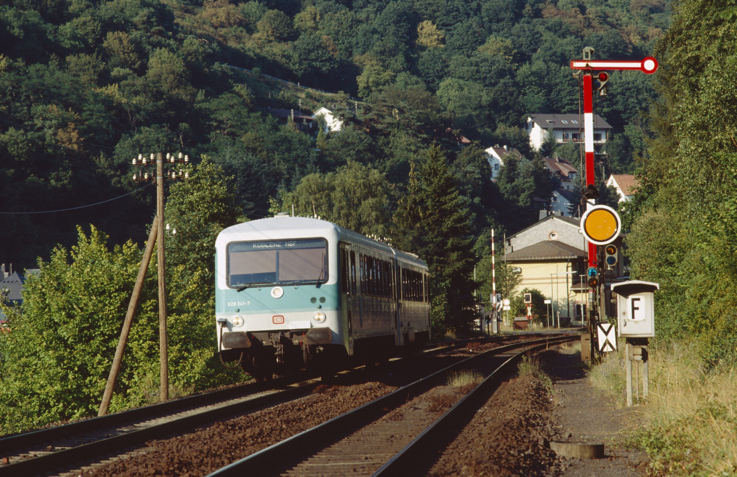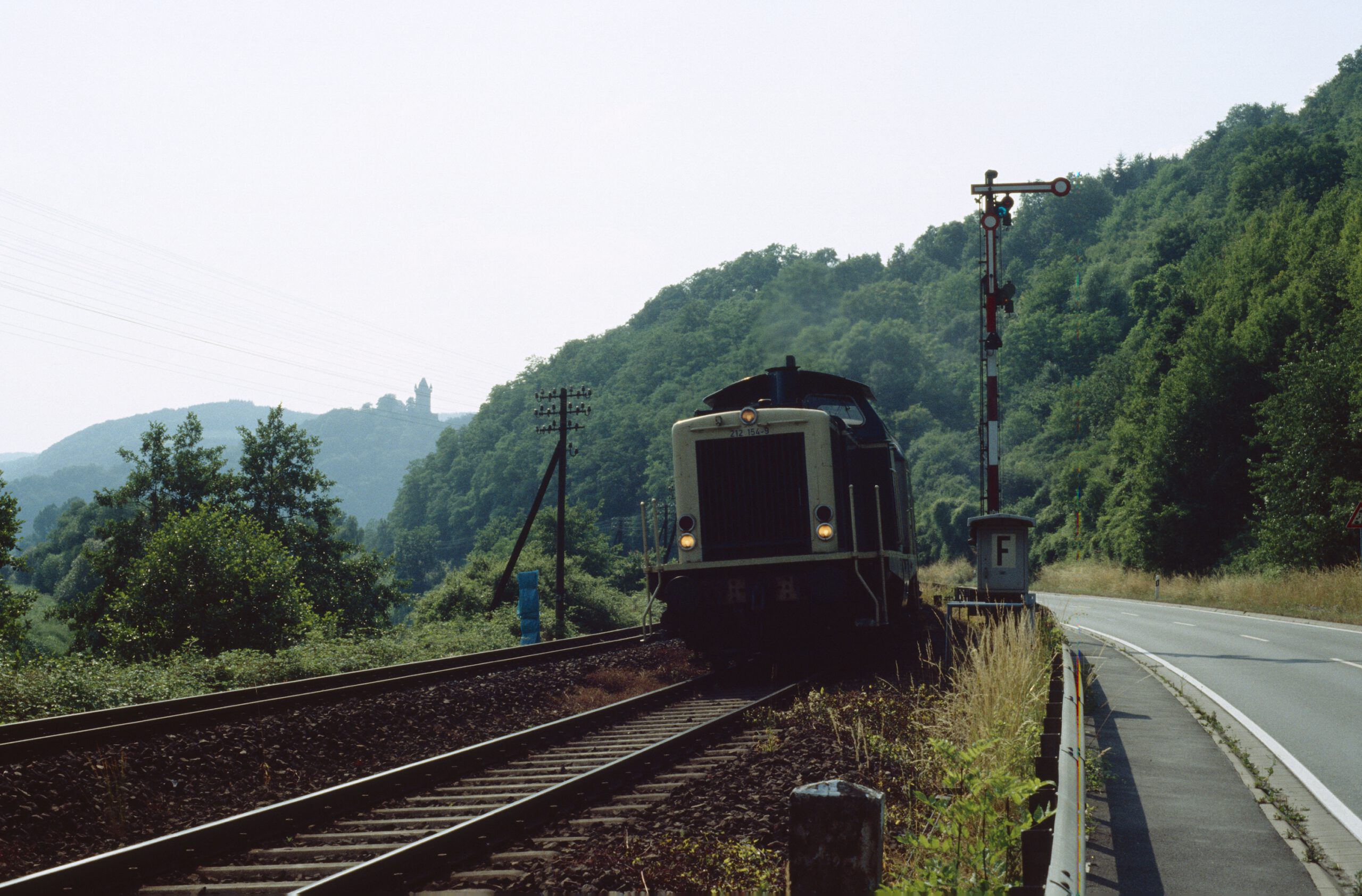 Im Lahntal waren in den 1980er Jahren recht häufig Wagenkästen alter Güterwaggons neben der Strecke aufgestellt. So auch dieser Wagenkasten vermutlich eines ehemaligen G 10-Güterwaggons neben dem Einfahr-Vorsignal von Laurenburg, an dem am 16. Mai 1988 diese dreiteilige Schienenbusgarnitur vorbei knattert