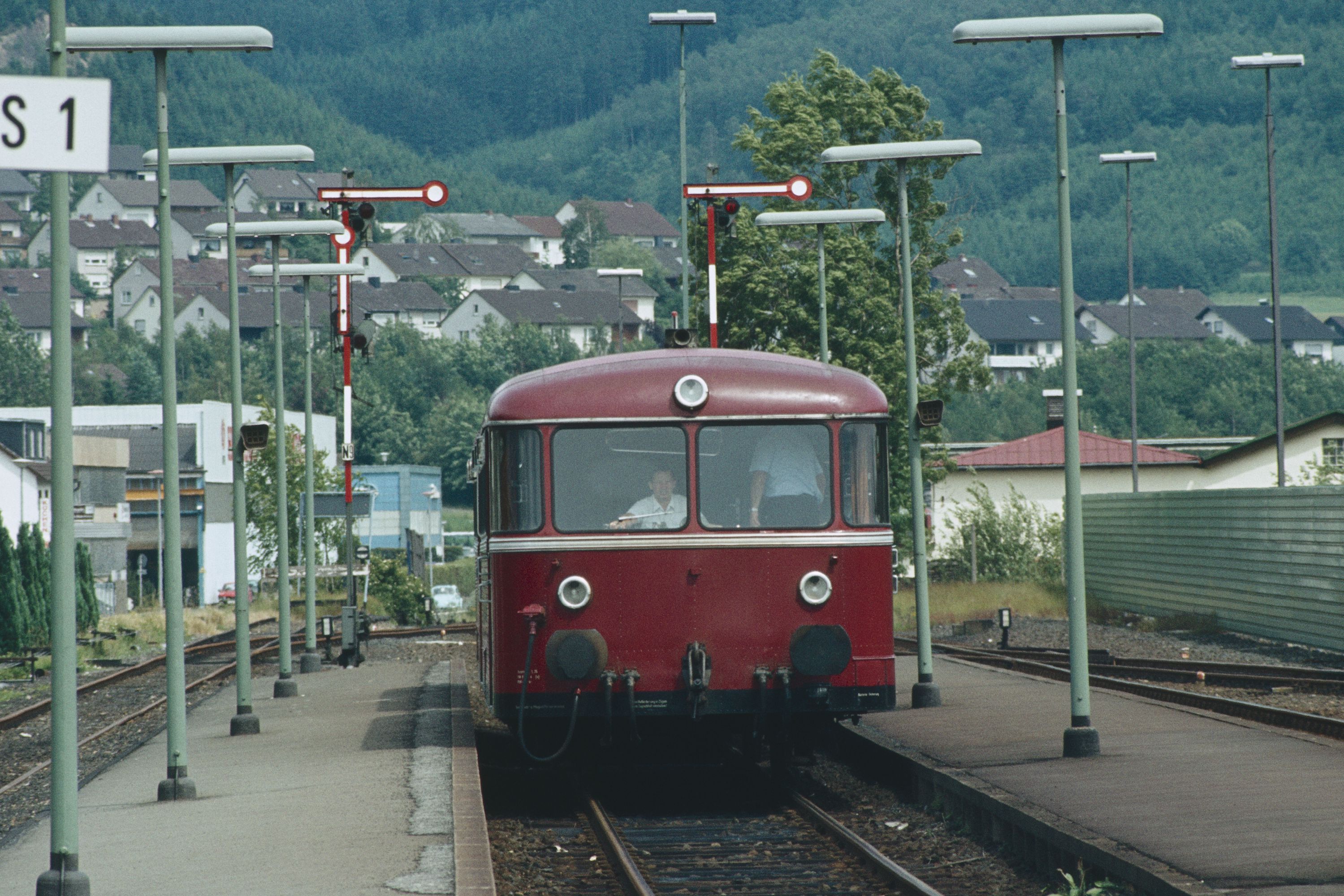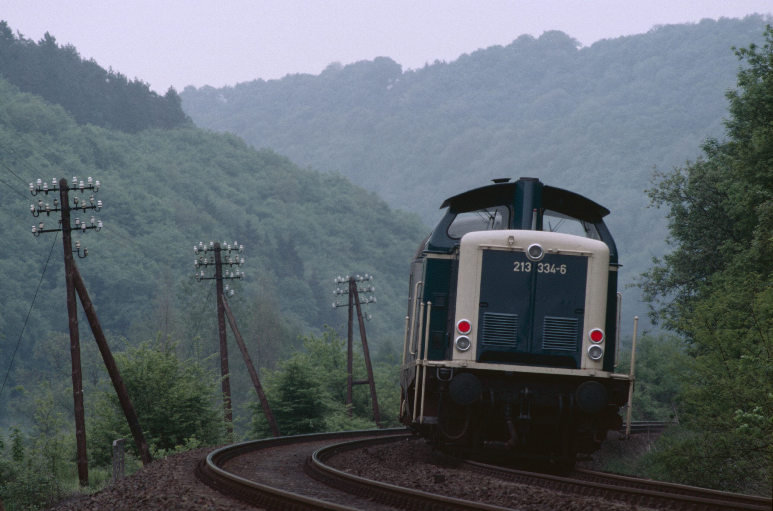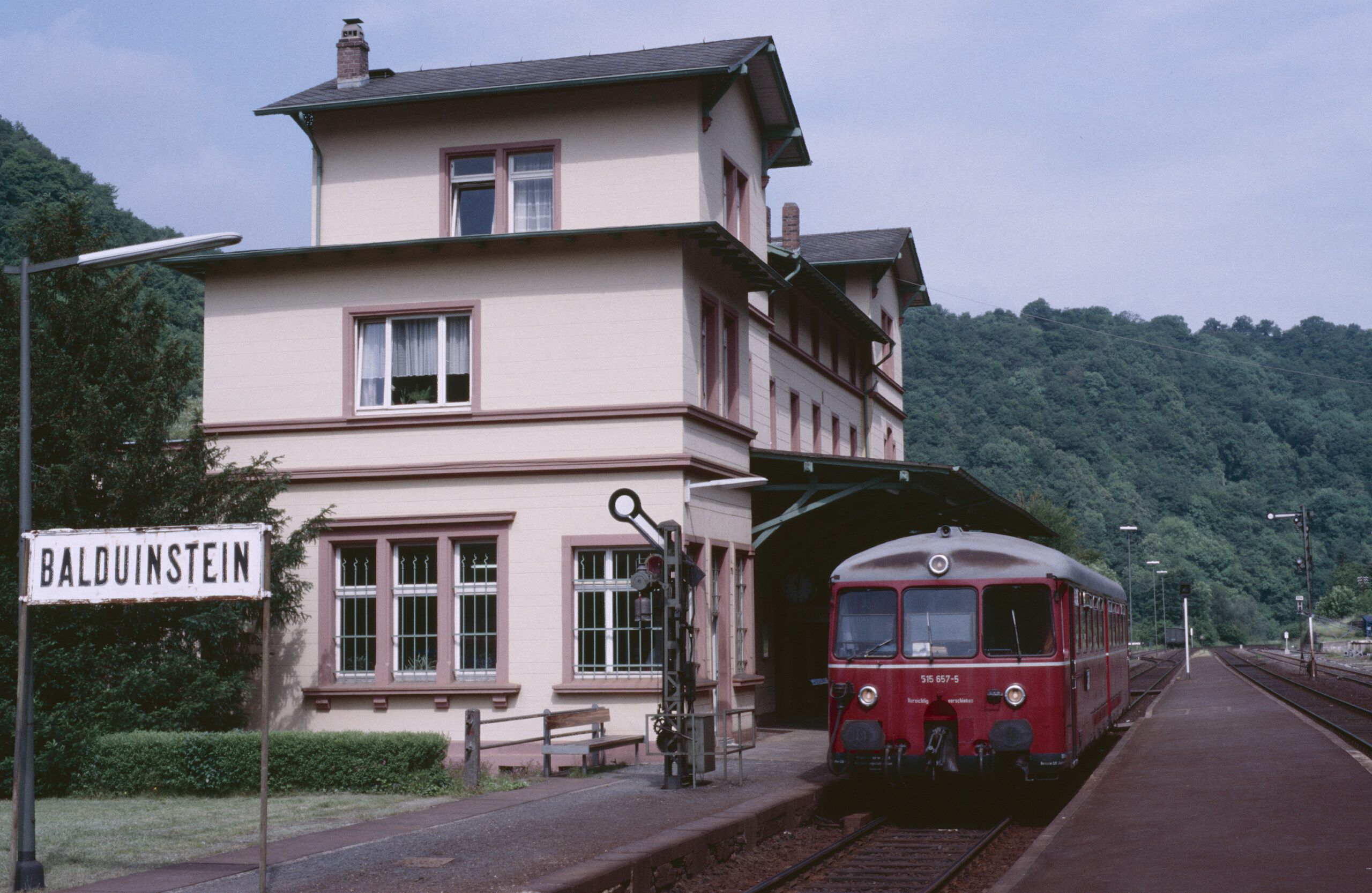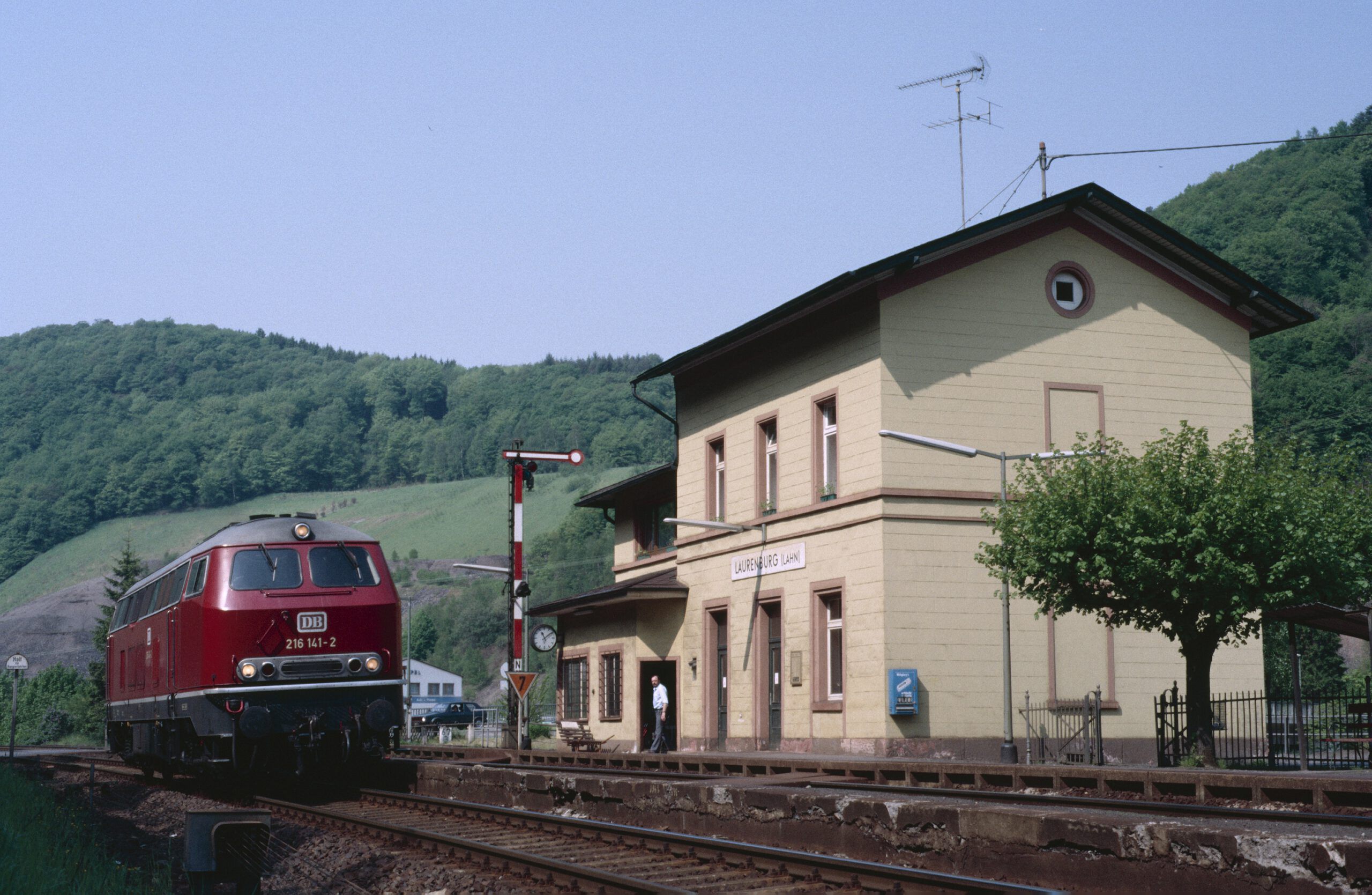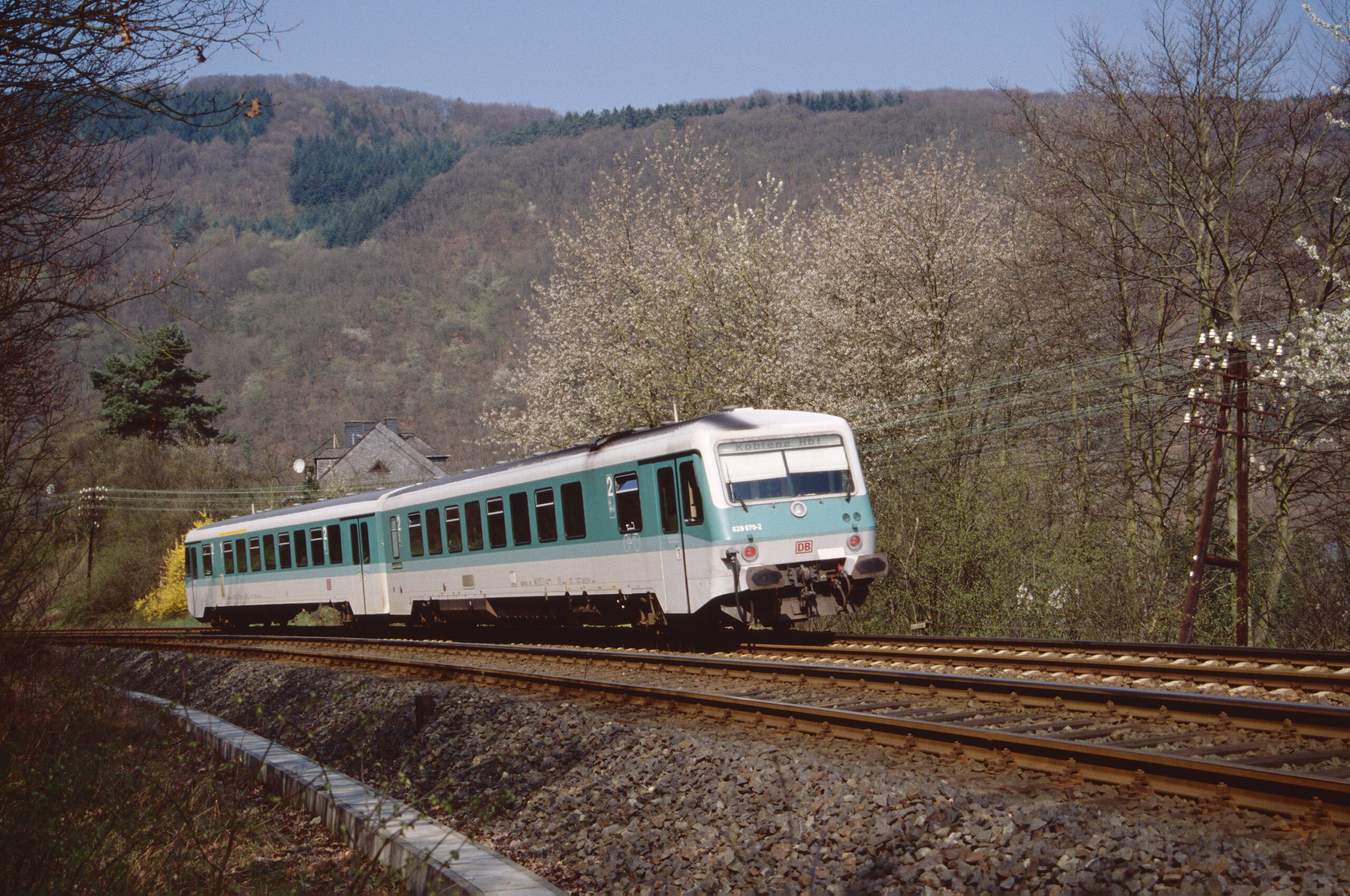 Im Lahntal waren in den 1980er Jahren recht häufig Wagenkästen alter Güterwaggons neben der Strecke aufgestellt. So auch dieser Wagenkasten vermutlich eines ehemaligen G 10-Güterwaggons neben dem Einfahr-Vorsignal von Laurenburg, an dem am 16. Mai 1988 diese dreiteilige Schienenbusgarnitur vorbei knattert