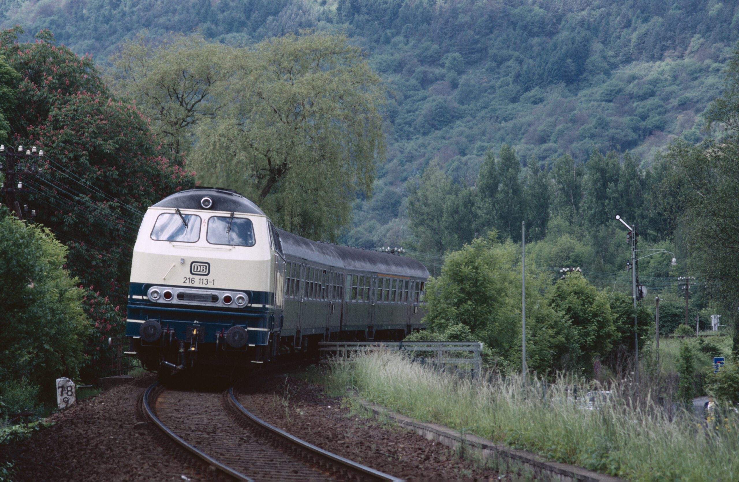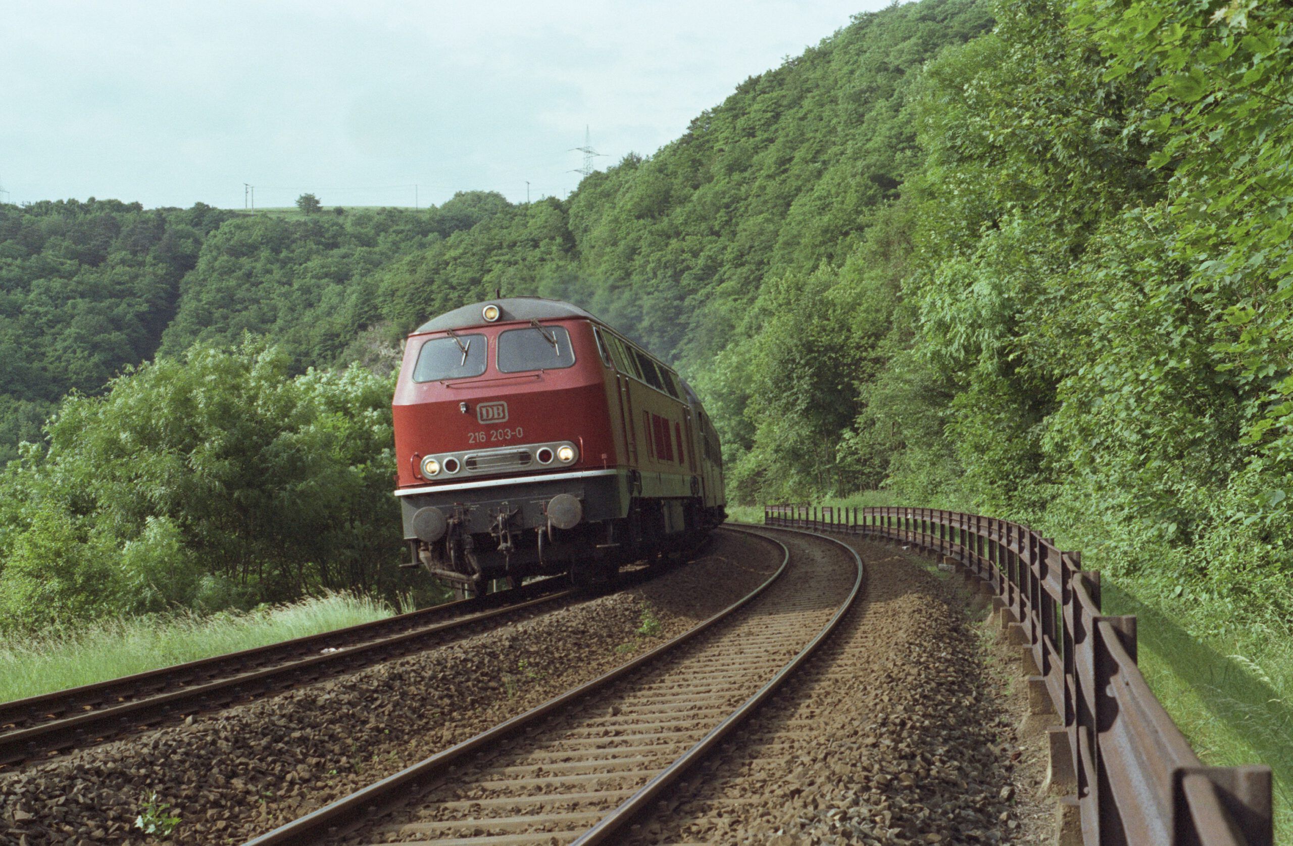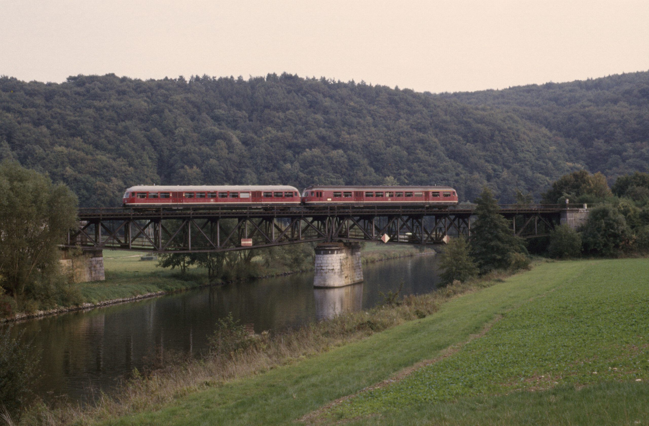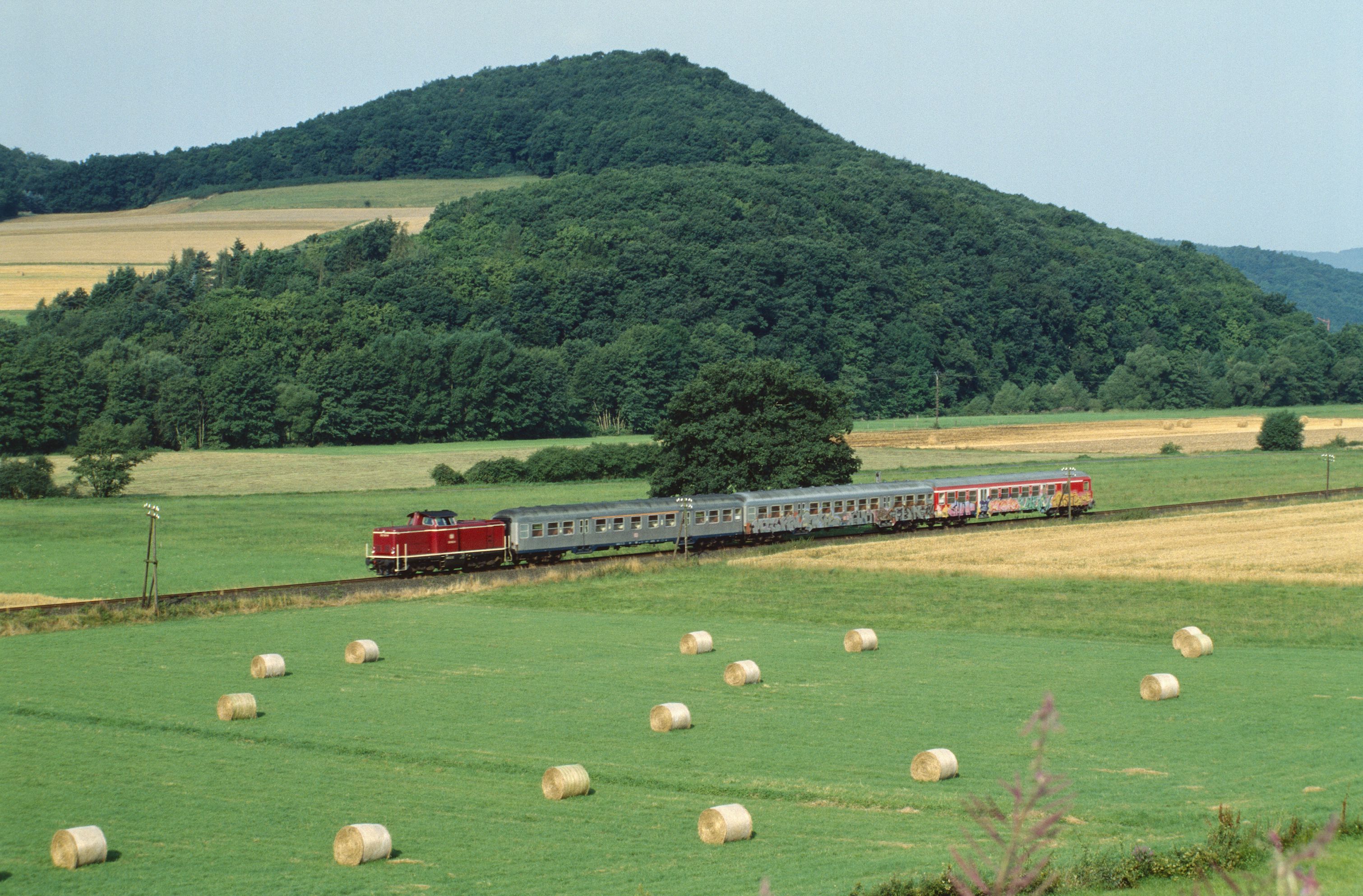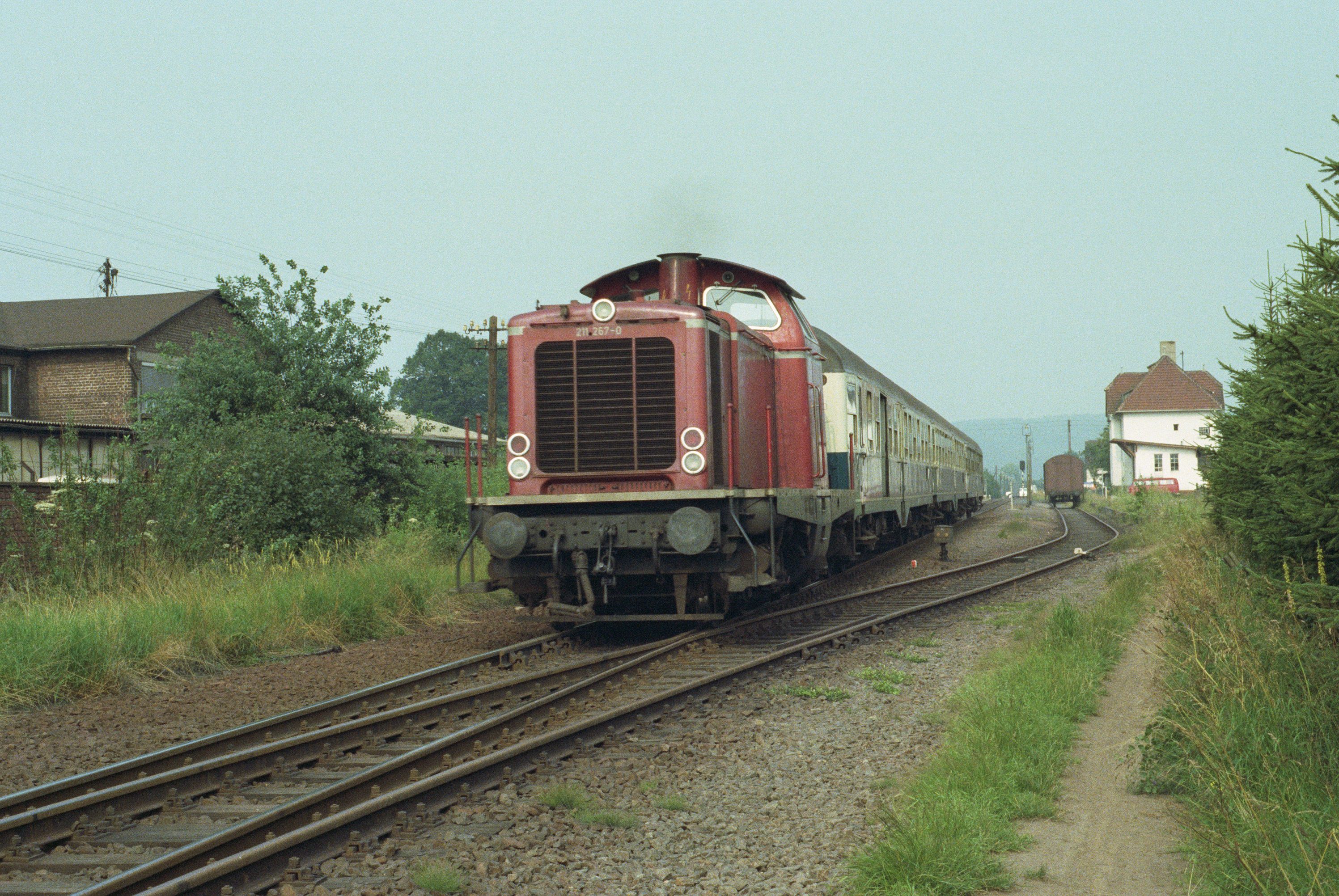 Im Lahntal waren in den 1980er Jahren recht häufig Wagenkästen alter Güterwaggons neben der Strecke aufgestellt. So auch dieser Wagenkasten vermutlich eines ehemaligen G 10-Güterwaggons neben dem Einfahr-Vorsignal von Laurenburg, an dem am 16. Mai 1988 diese dreiteilige Schienenbusgarnitur vorbei knattert
