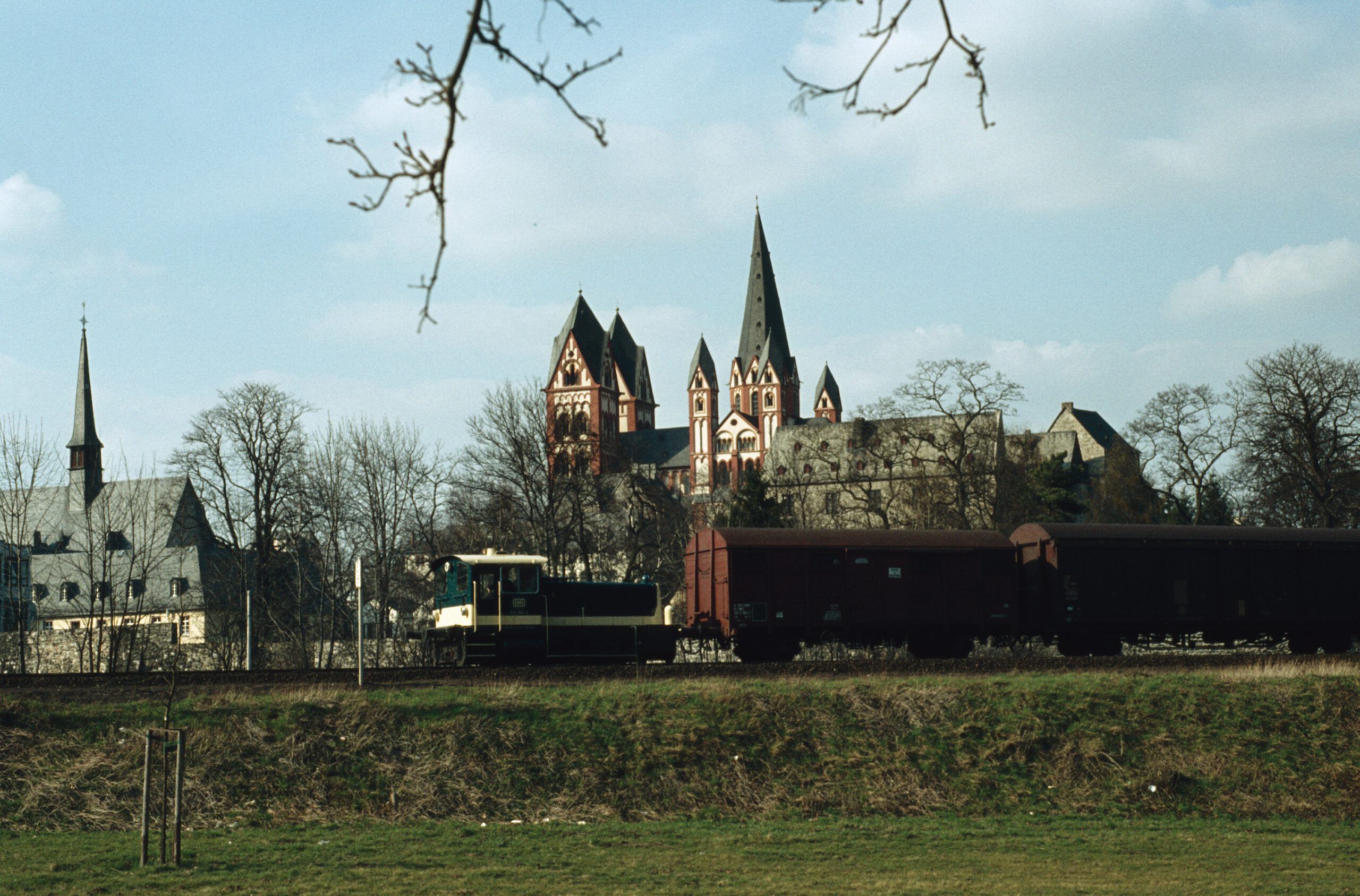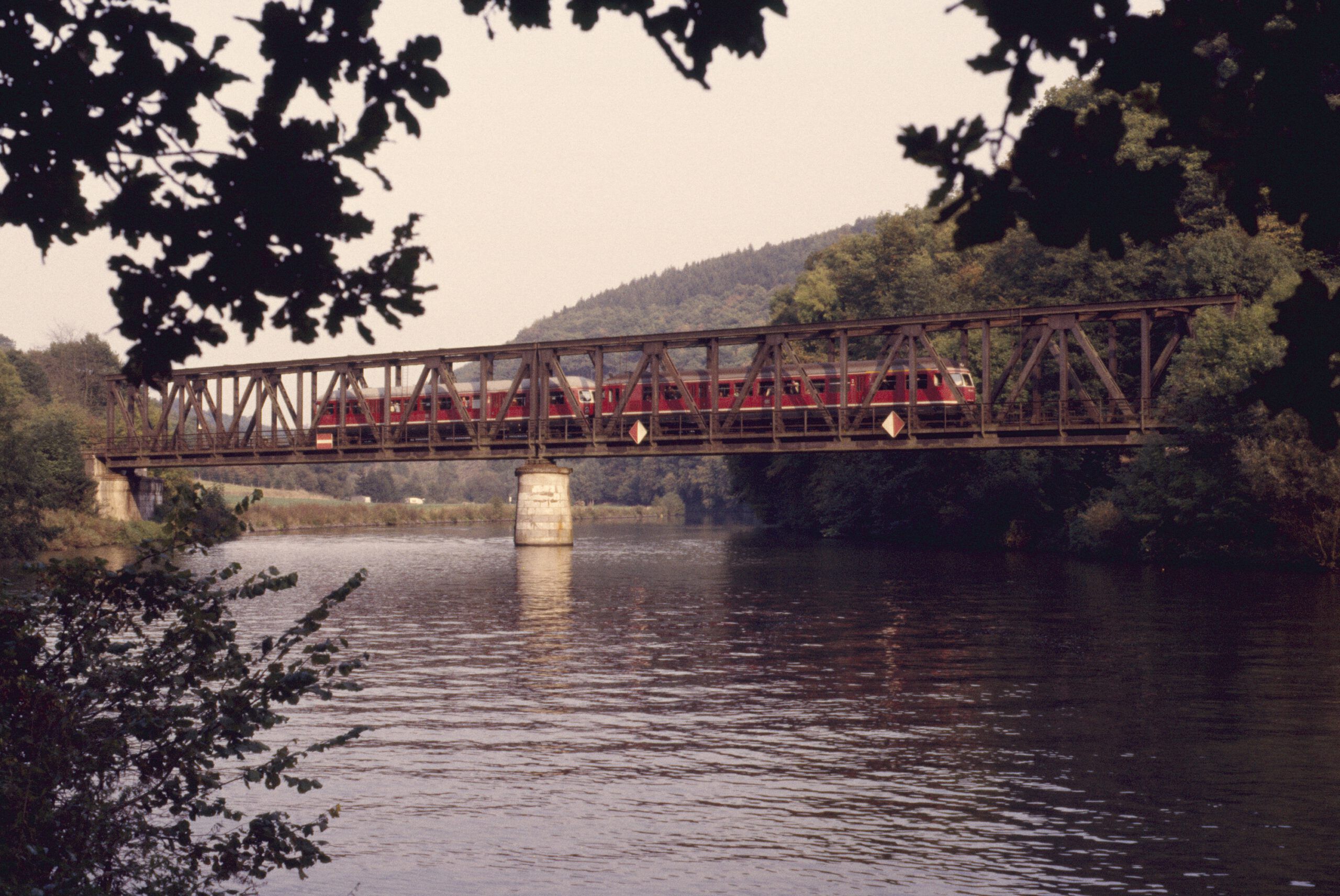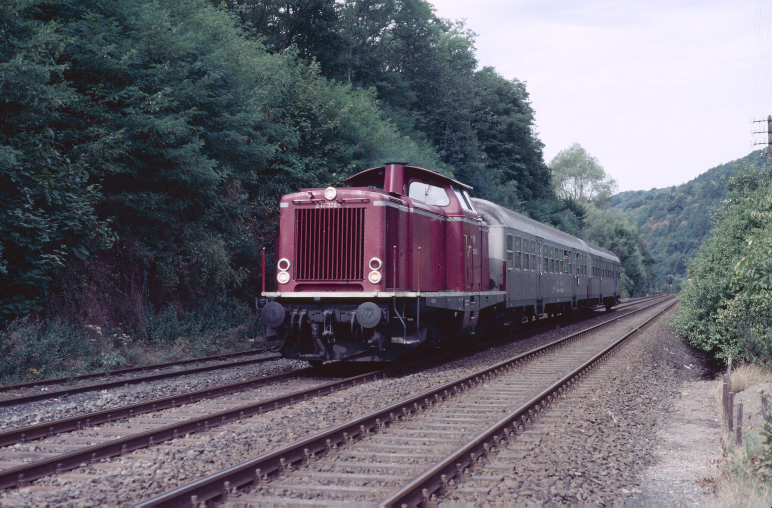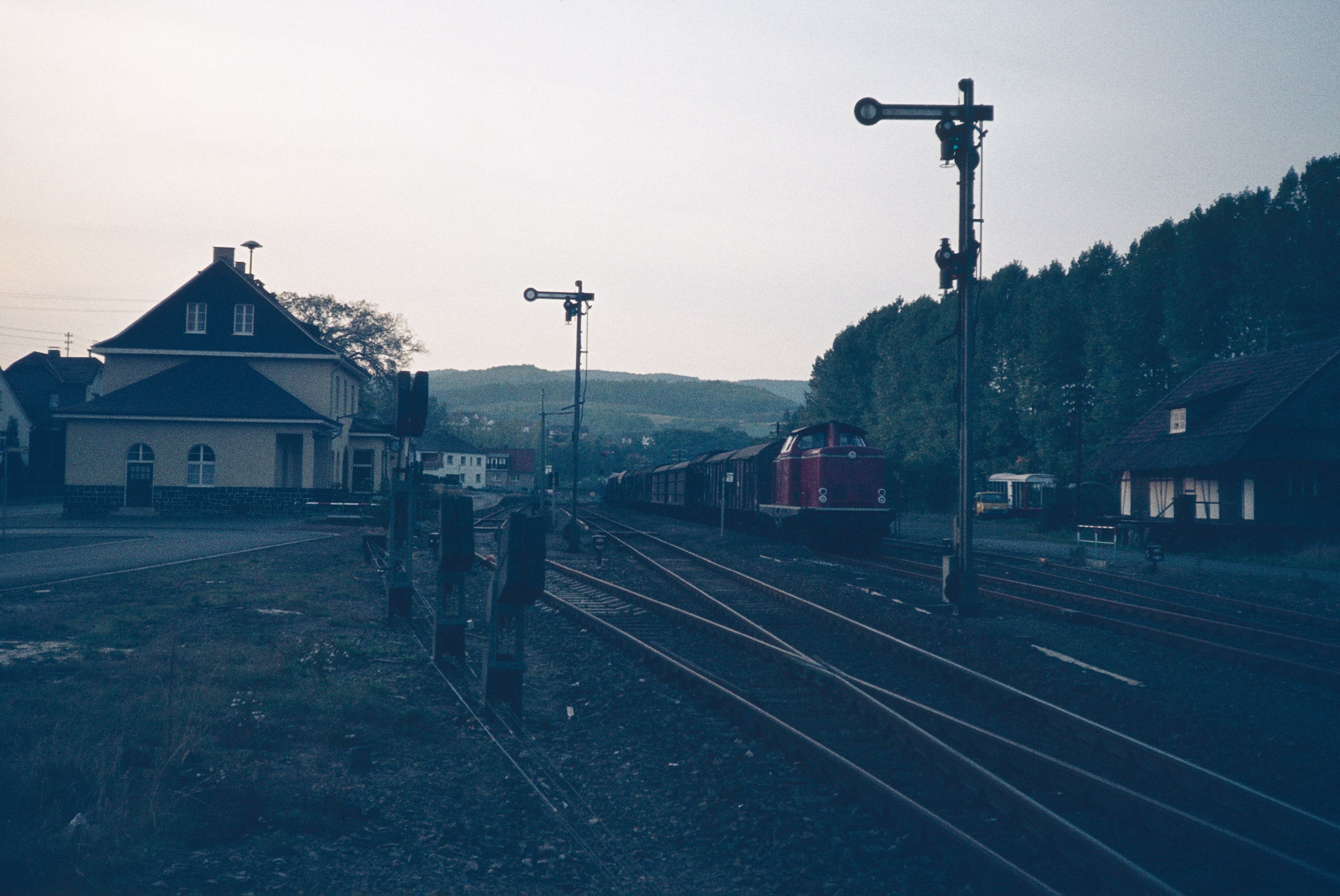 Im Lahntal waren in den 1980er Jahren recht häufig Wagenkästen alter Güterwaggons neben der Strecke aufgestellt. So auch dieser Wagenkasten vermutlich eines ehemaligen G 10-Güterwaggons neben dem Einfahr-Vorsignal von Laurenburg, an dem am 16. Mai 1988 diese dreiteilige Schienenbusgarnitur vorbei knattert