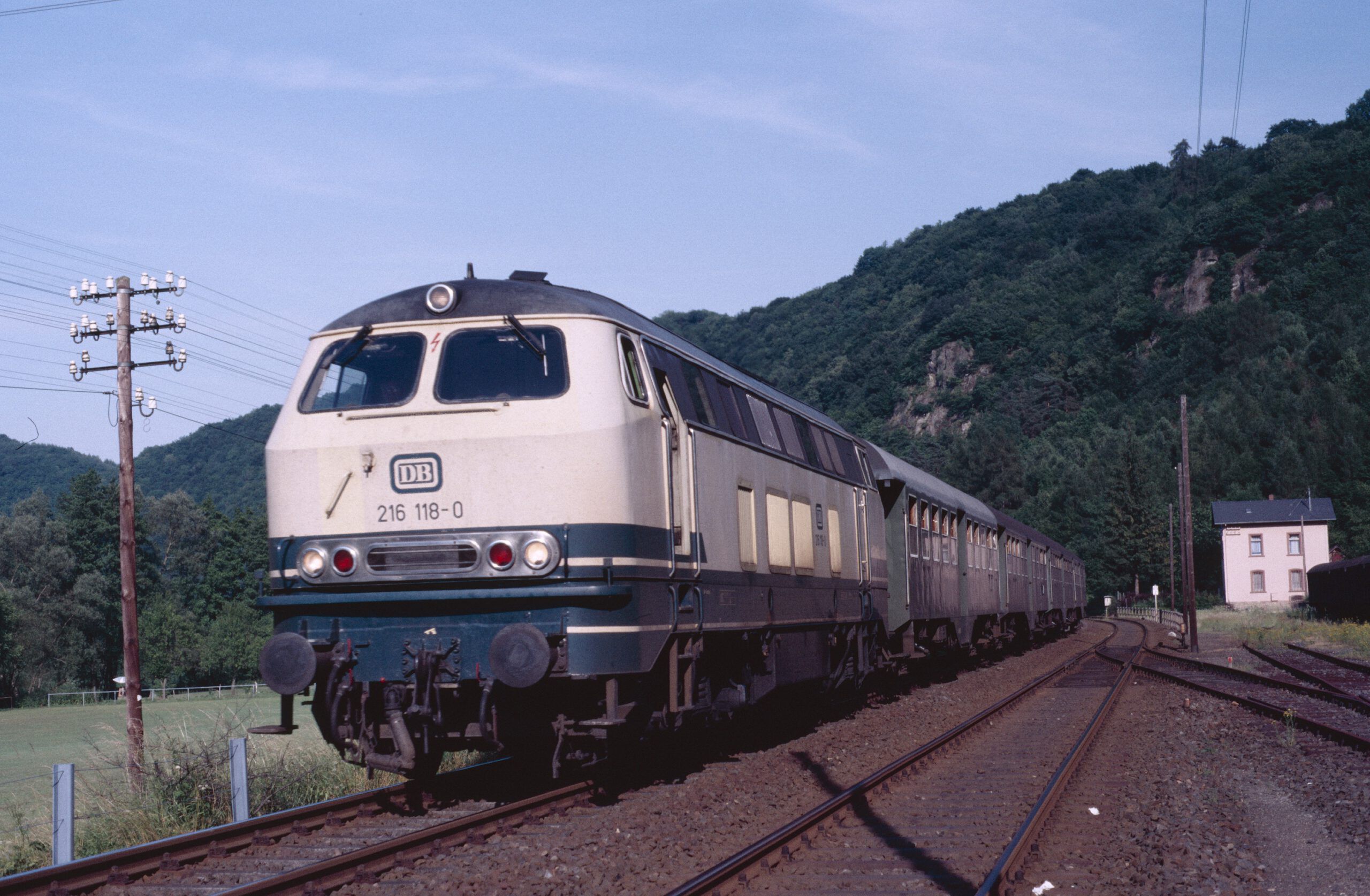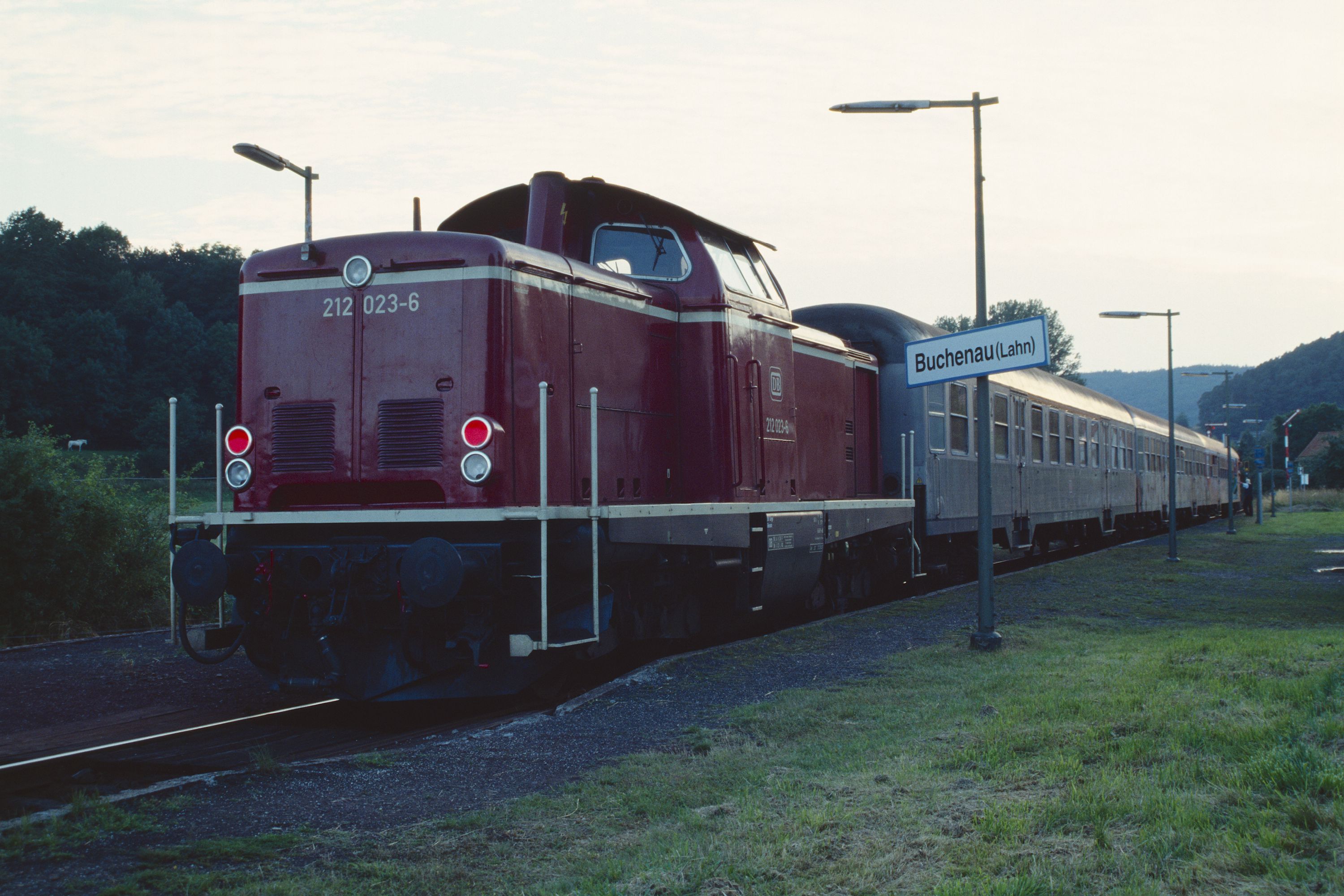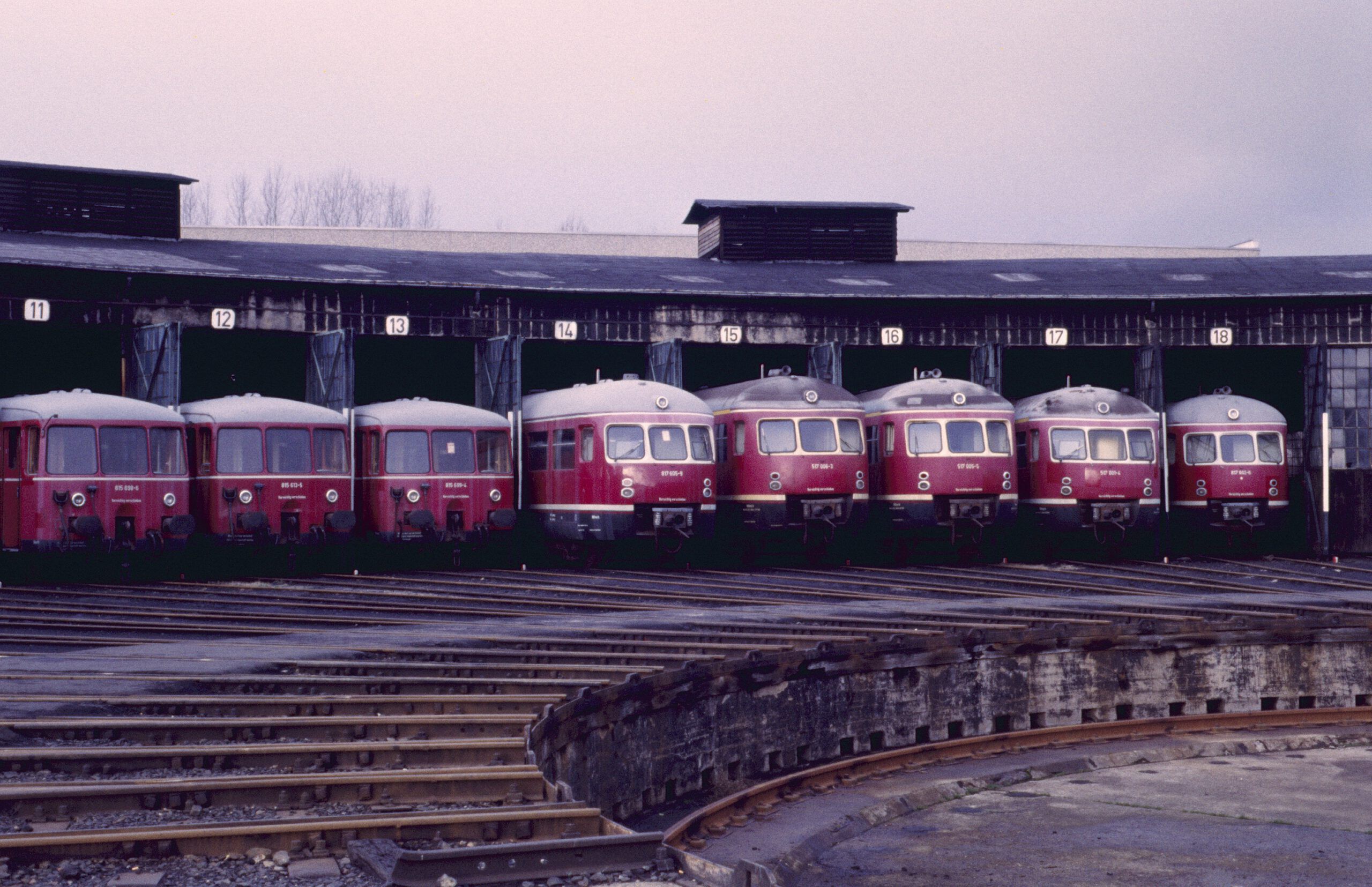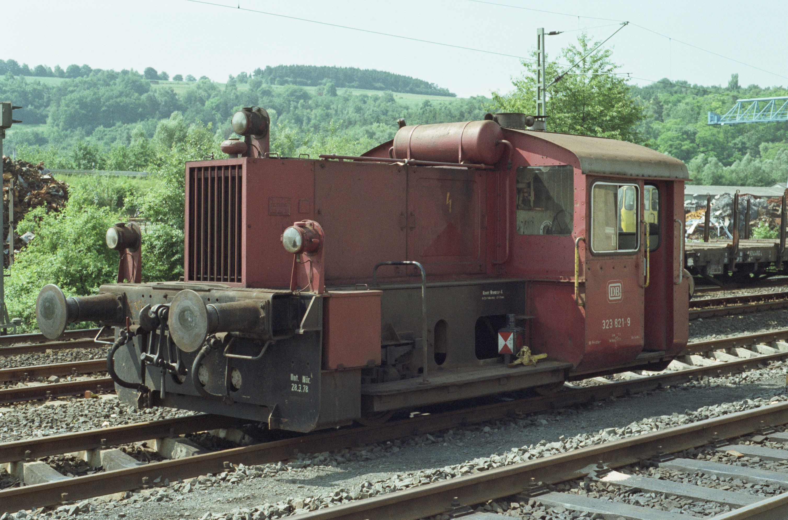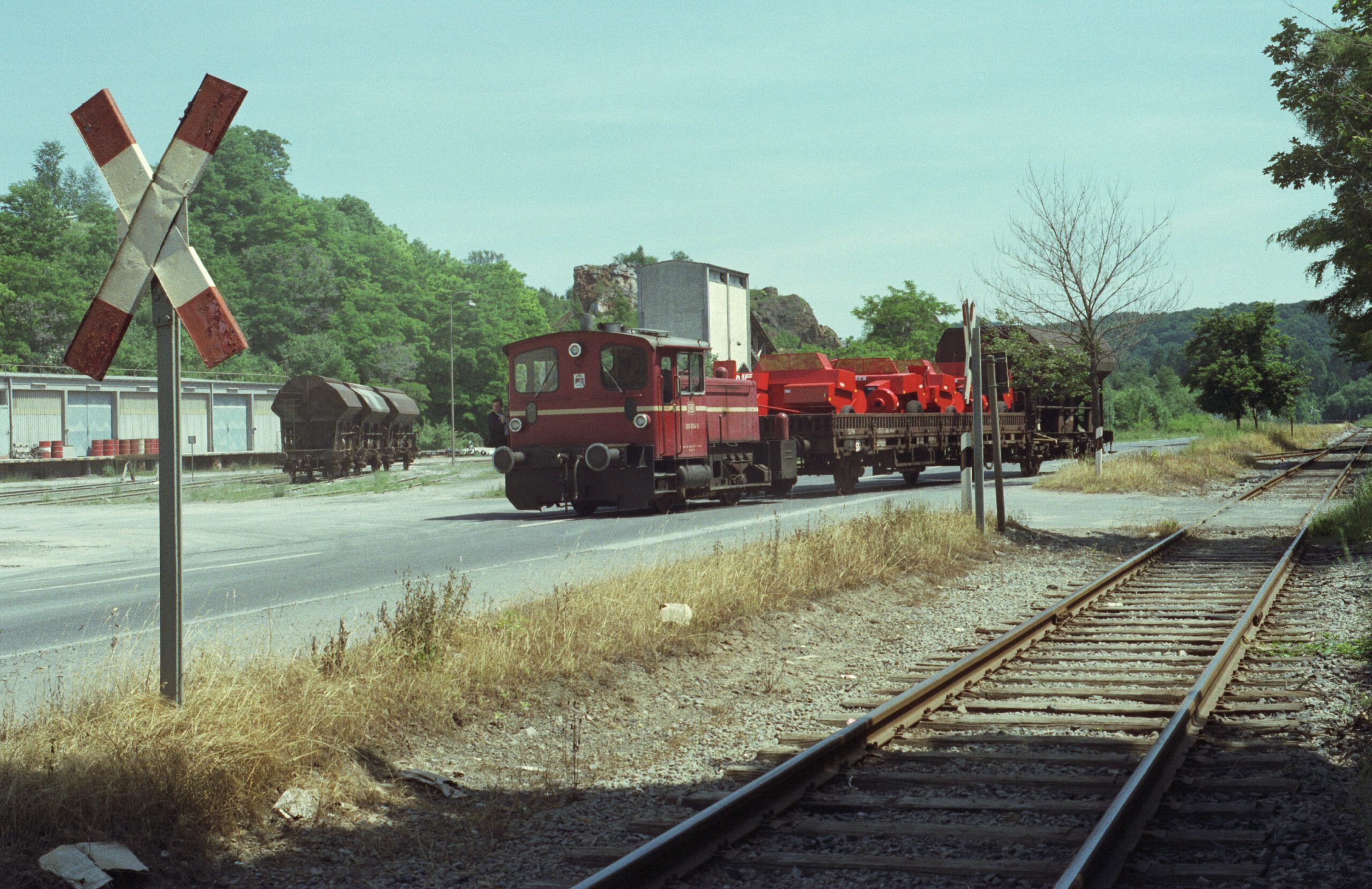 Im Lahntal waren in den 1980er Jahren recht häufig Wagenkästen alter Güterwaggons neben der Strecke aufgestellt. So auch dieser Wagenkasten vermutlich eines ehemaligen G 10-Güterwaggons neben dem Einfahr-Vorsignal von Laurenburg, an dem am 16. Mai 1988 diese dreiteilige Schienenbusgarnitur vorbei knattert