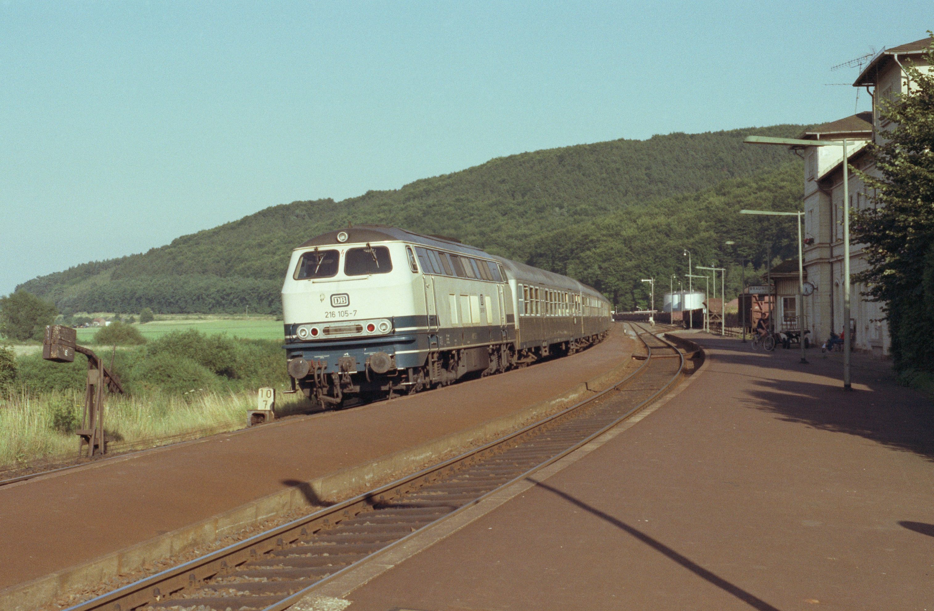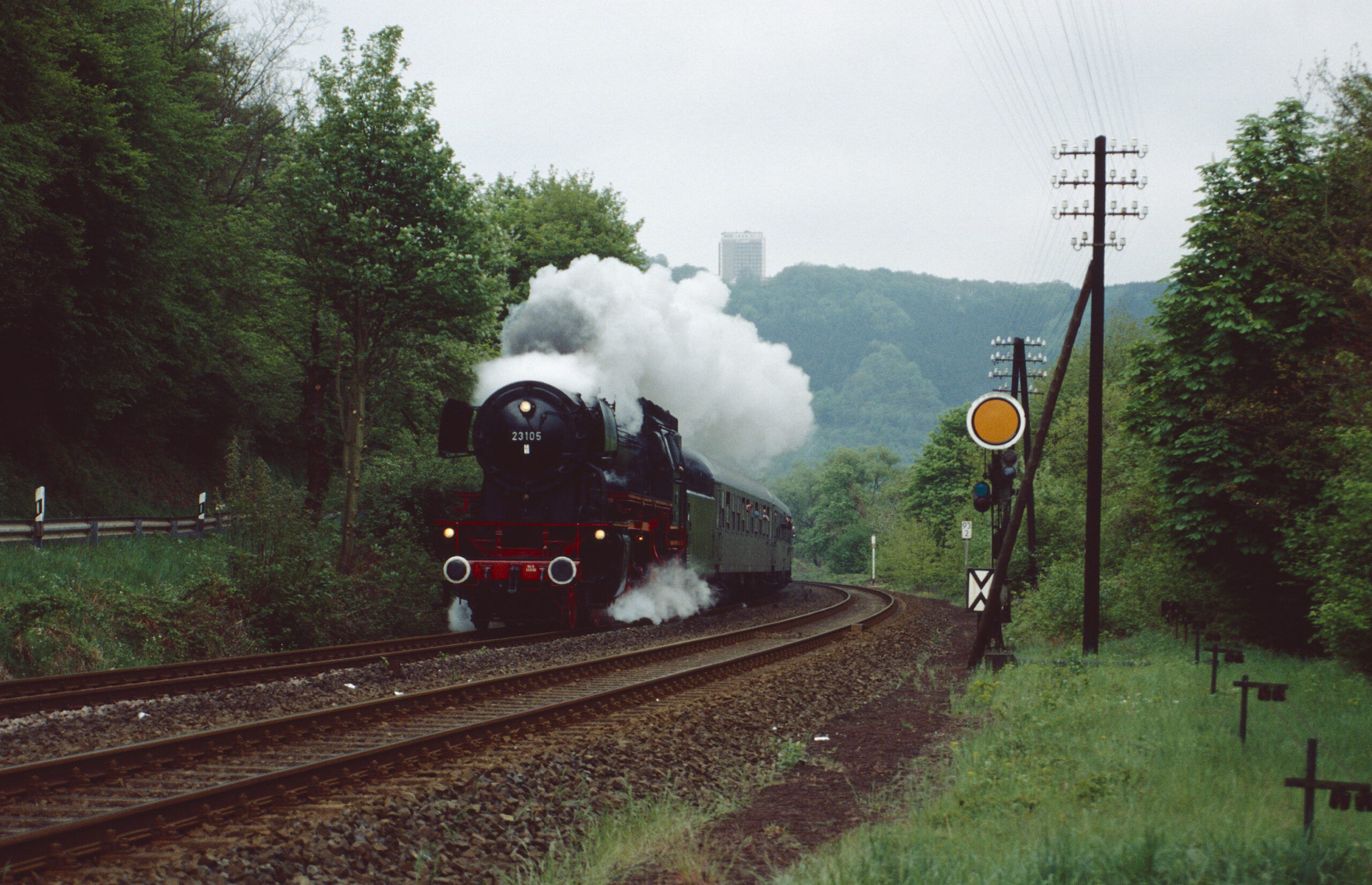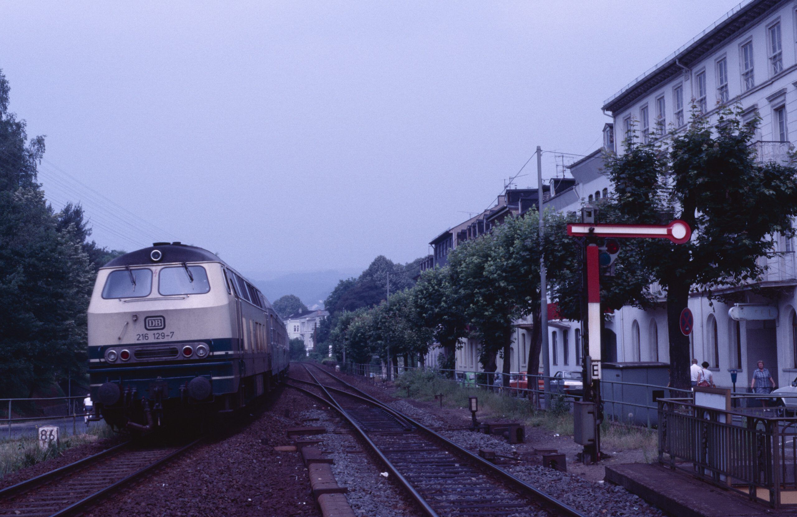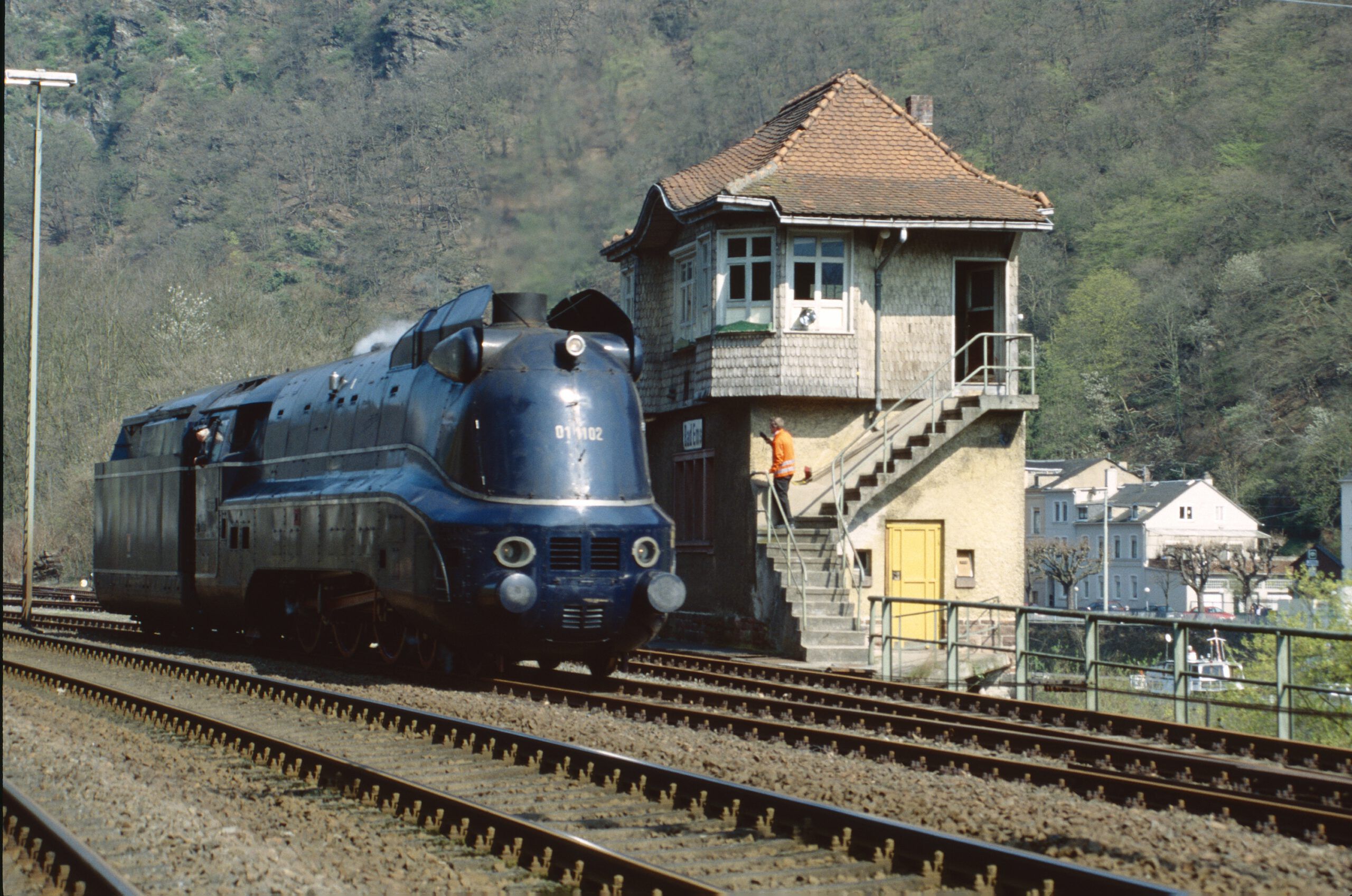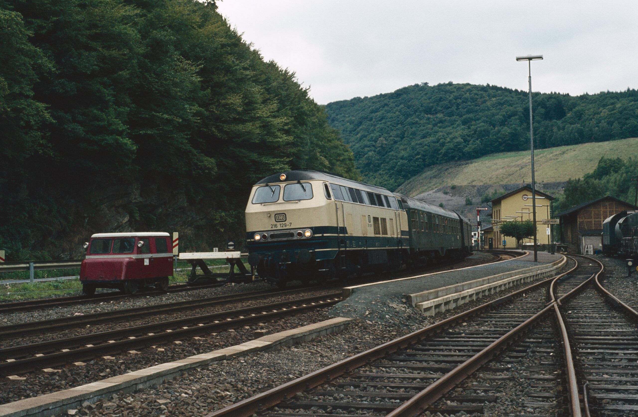 Im Lahntal waren in den 1980er Jahren recht häufig Wagenkästen alter Güterwaggons neben der Strecke aufgestellt. So auch dieser Wagenkasten vermutlich eines ehemaligen G 10-Güterwaggons neben dem Einfahr-Vorsignal von Laurenburg, an dem am 16. Mai 1988 diese dreiteilige Schienenbusgarnitur vorbei knattert