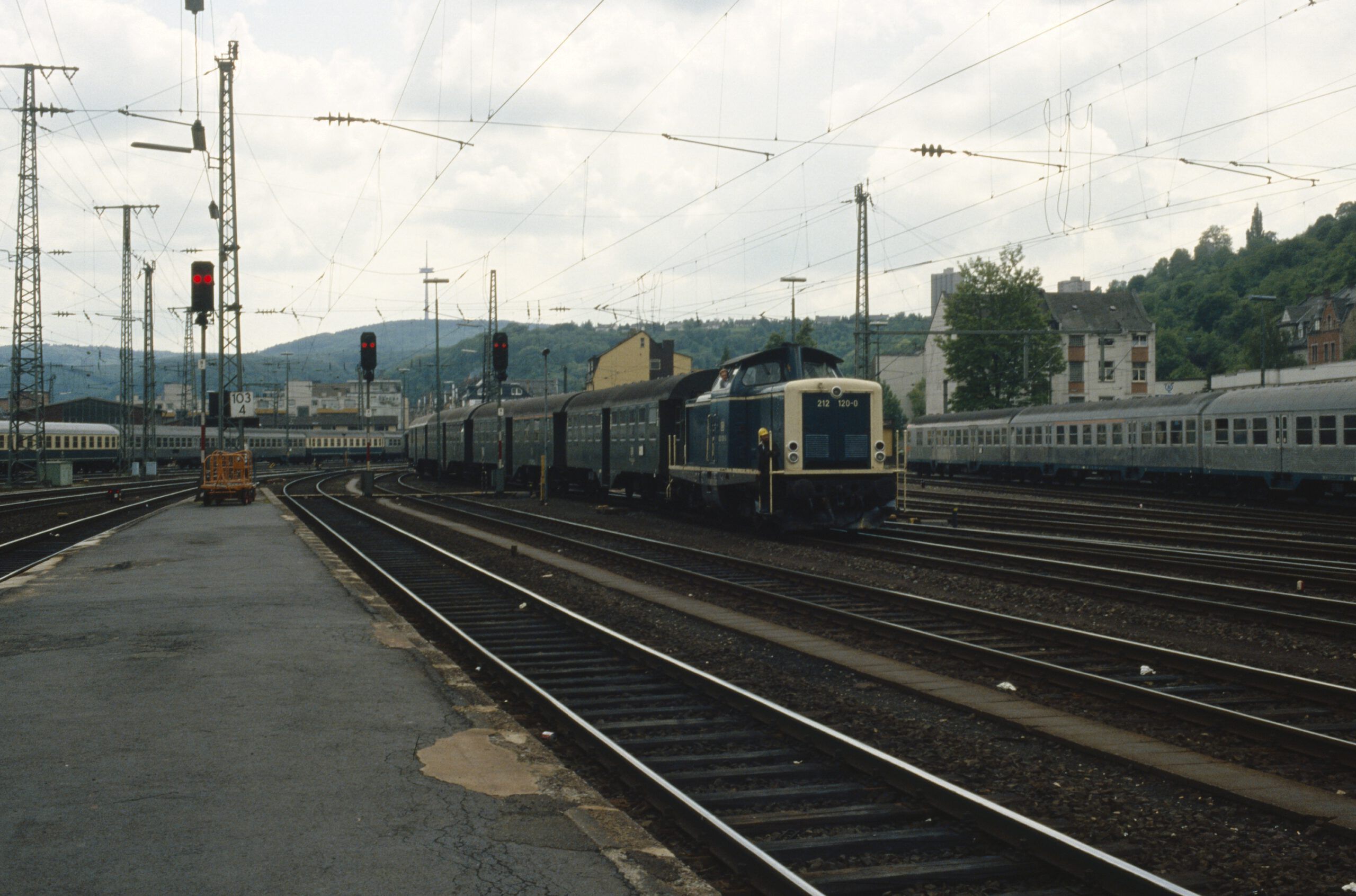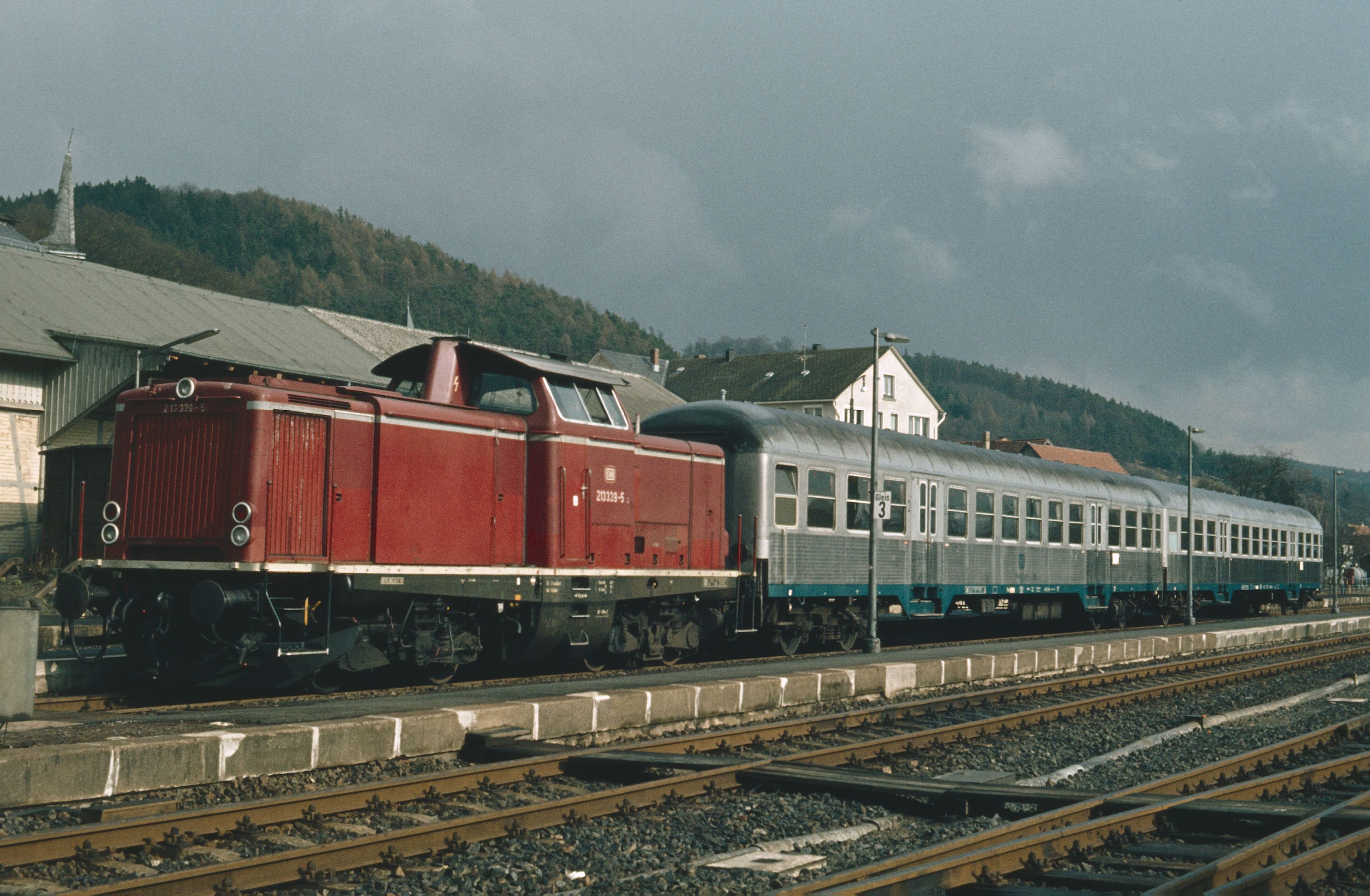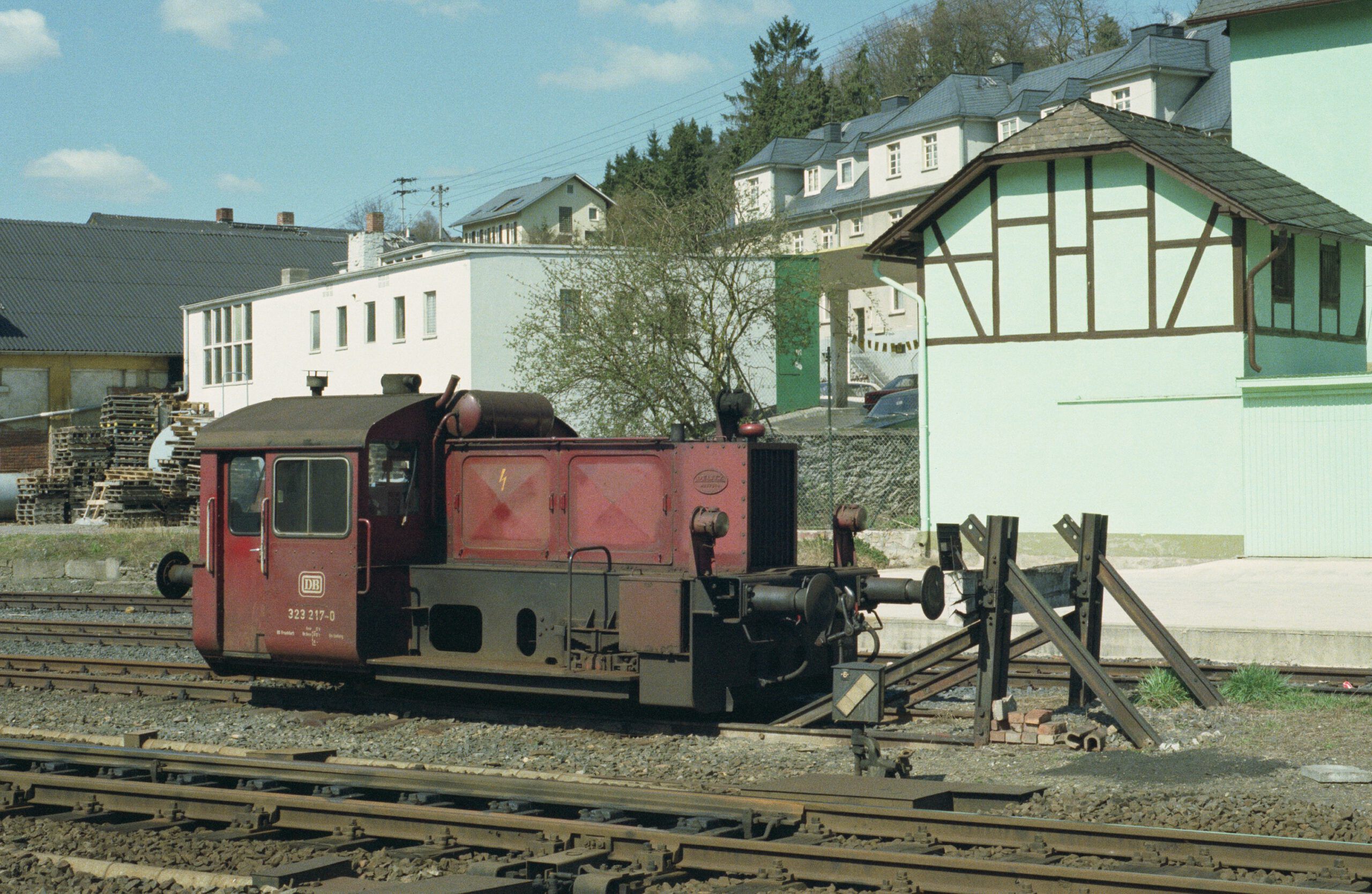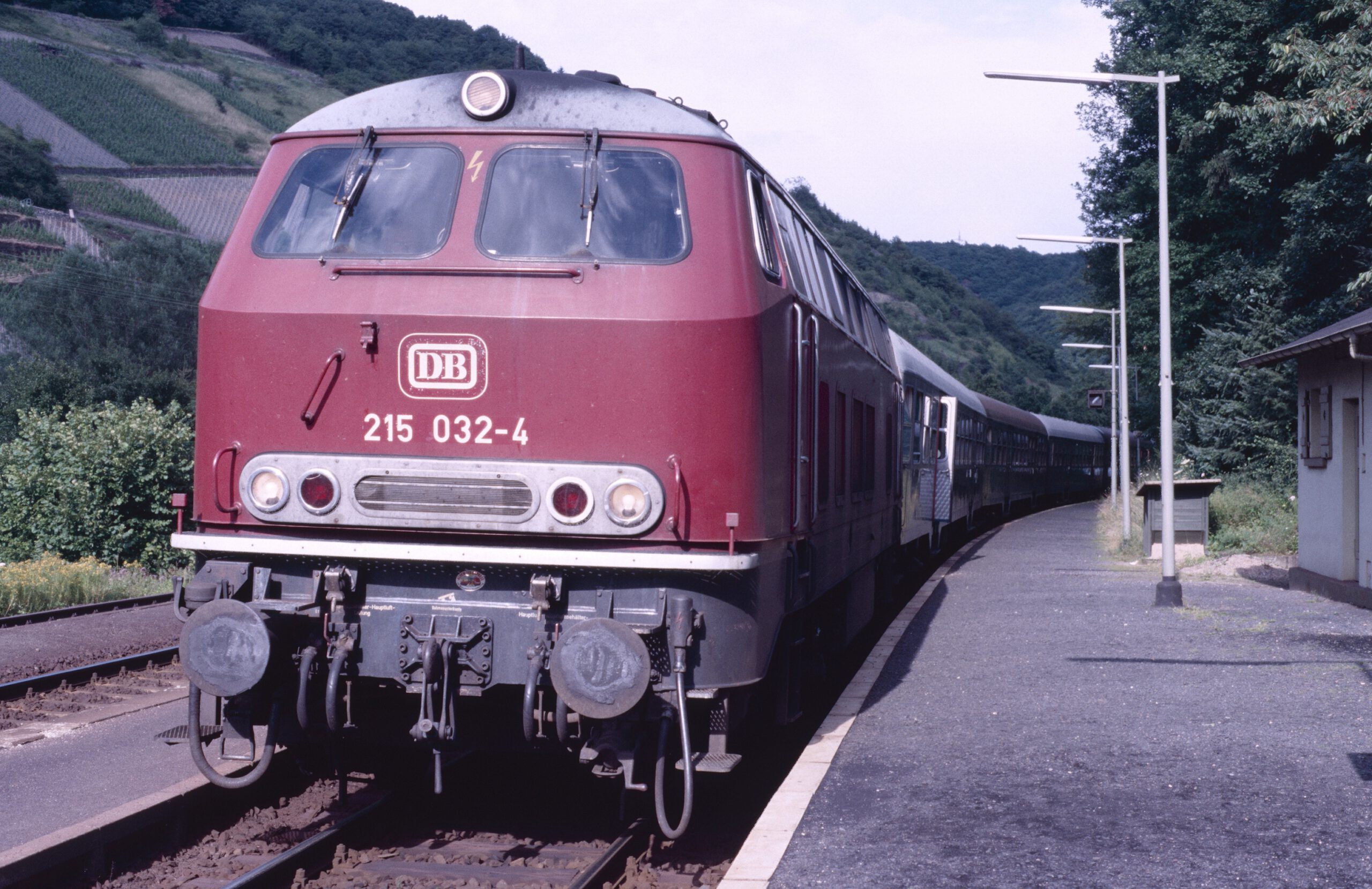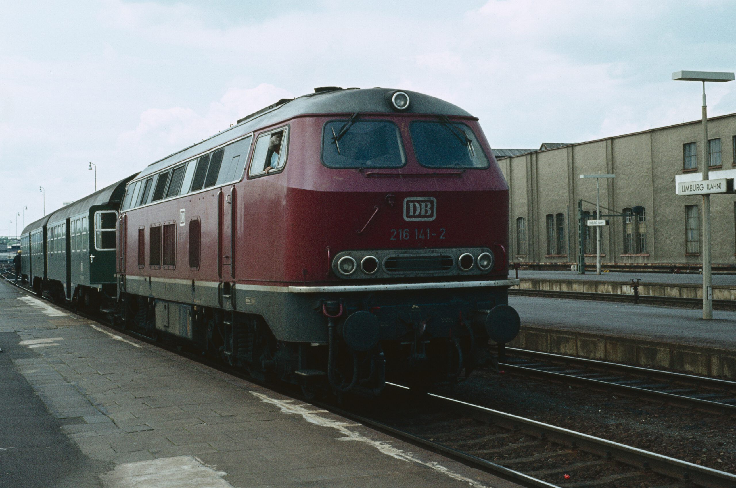 Im Lahntal waren in den 1980er Jahren recht häufig Wagenkästen alter Güterwaggons neben der Strecke aufgestellt. So auch dieser Wagenkasten vermutlich eines ehemaligen G 10-Güterwaggons neben dem Einfahr-Vorsignal von Laurenburg, an dem am 16. Mai 1988 diese dreiteilige Schienenbusgarnitur vorbei knattert