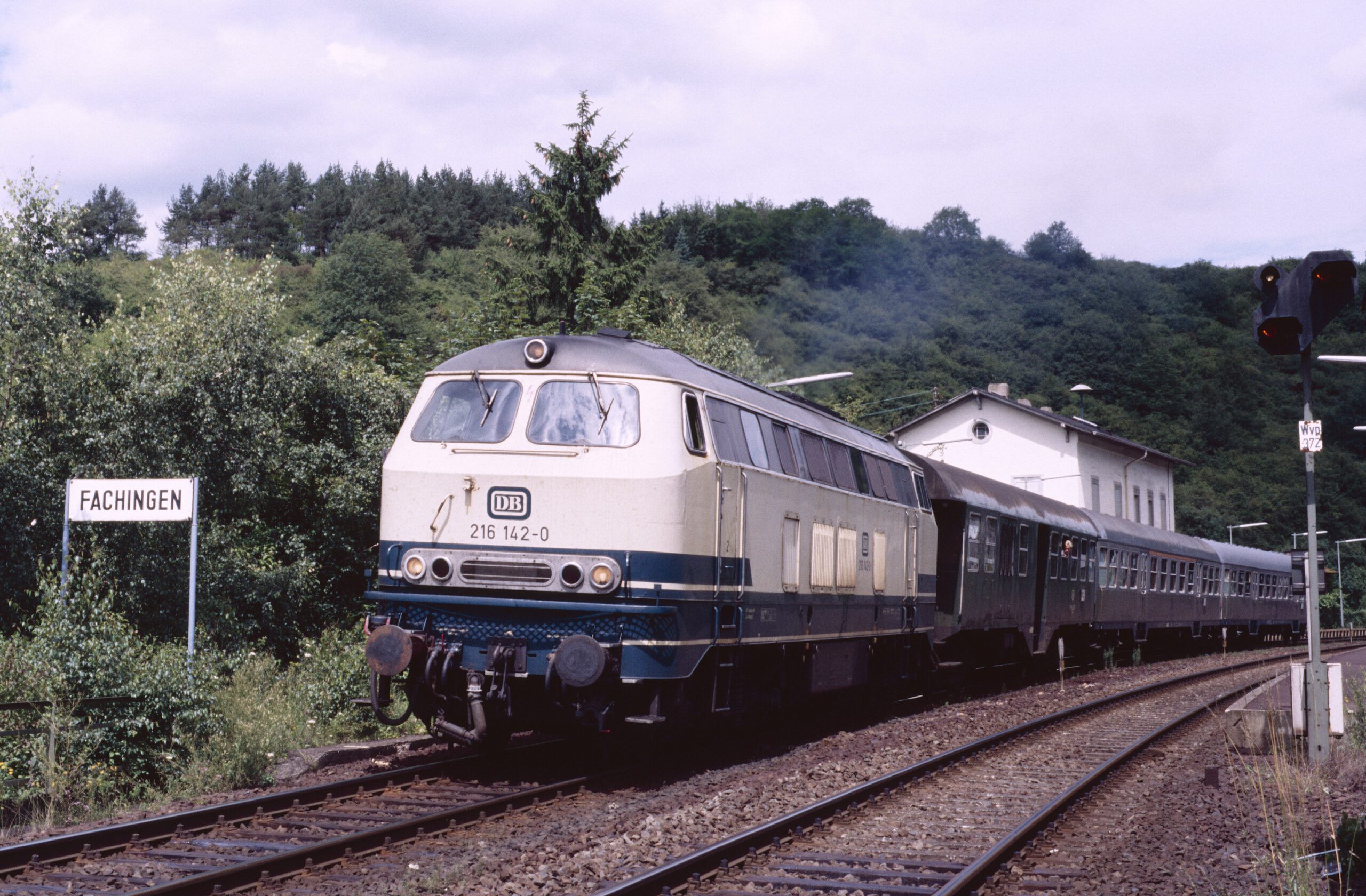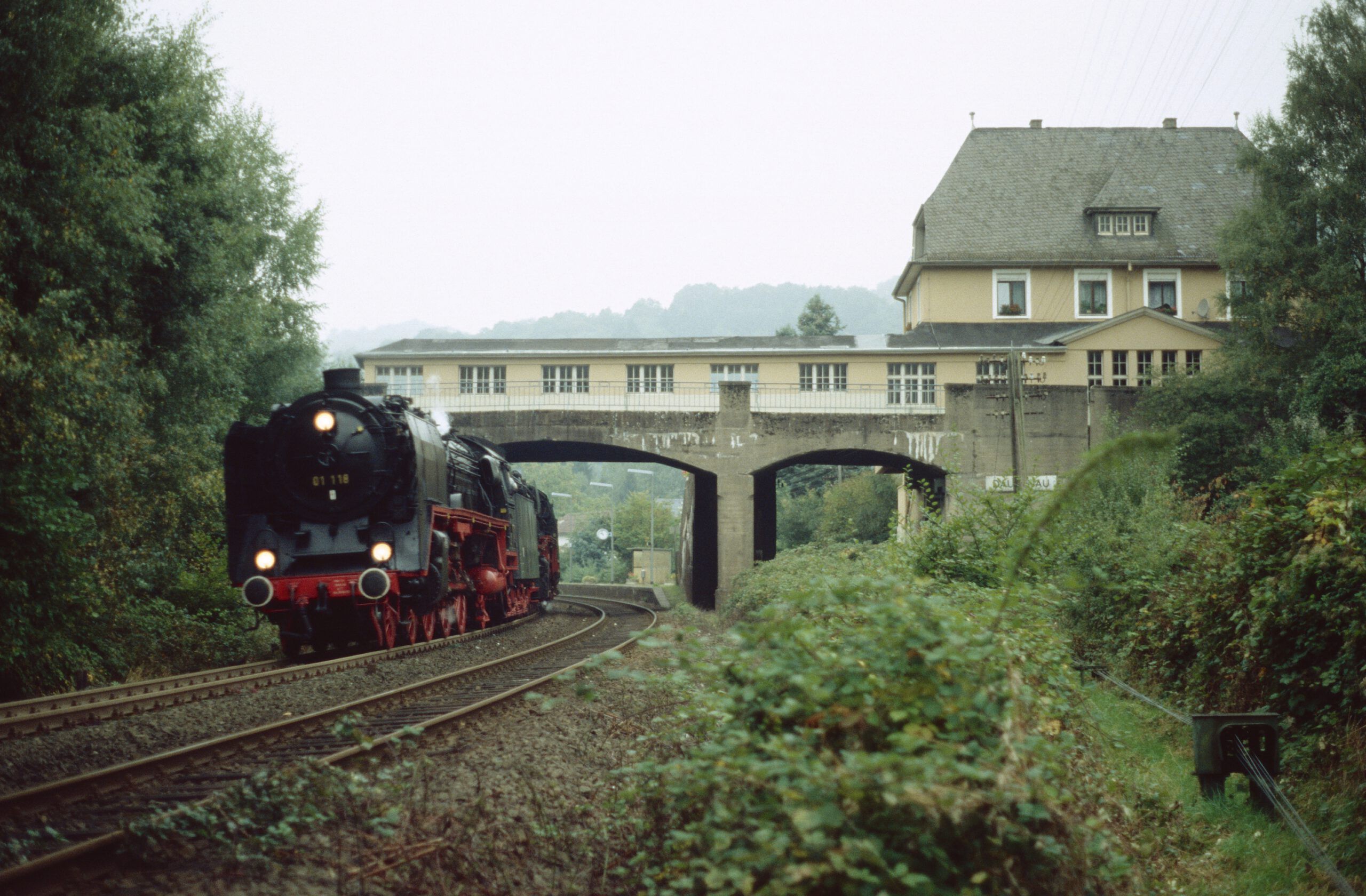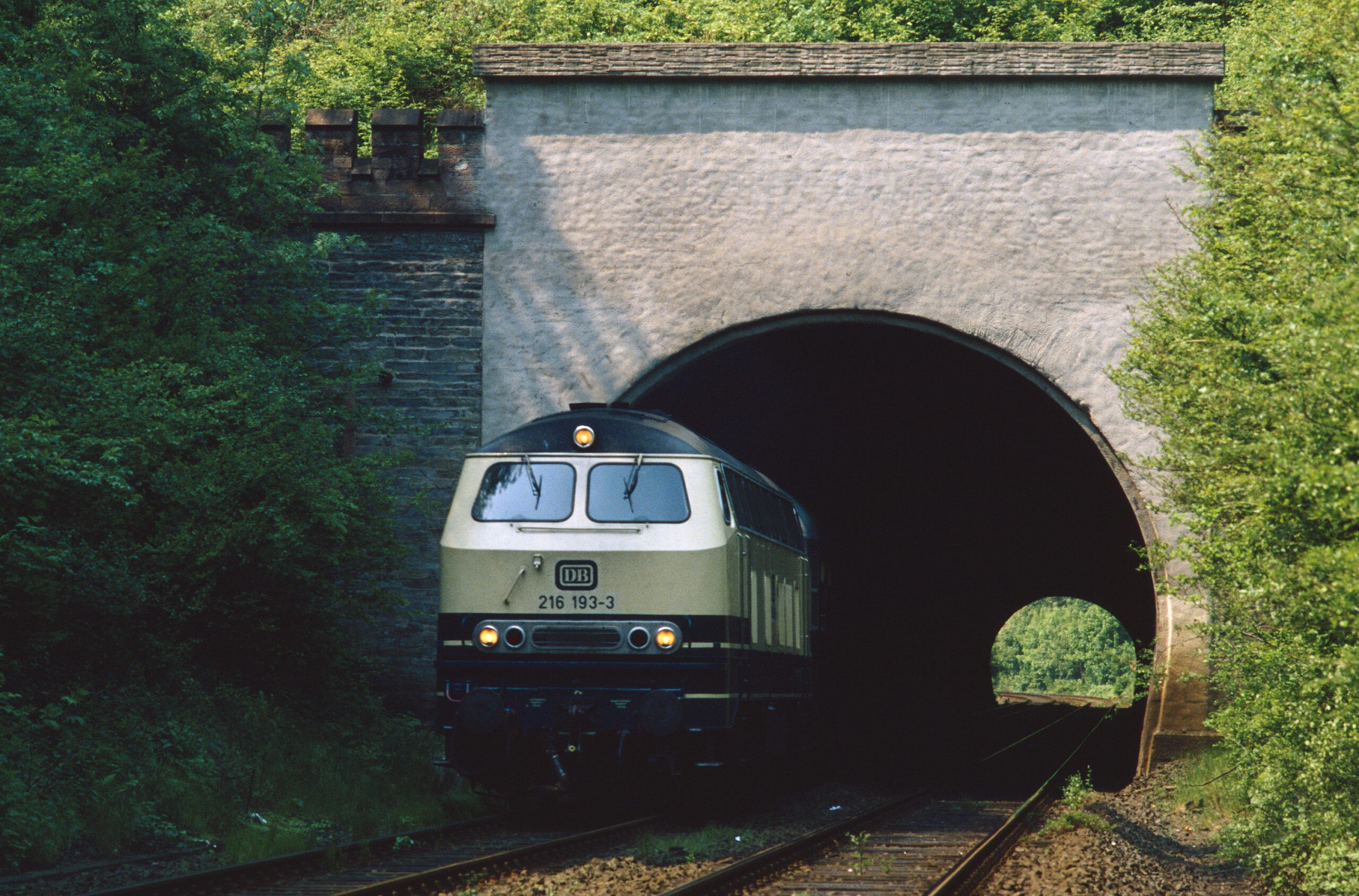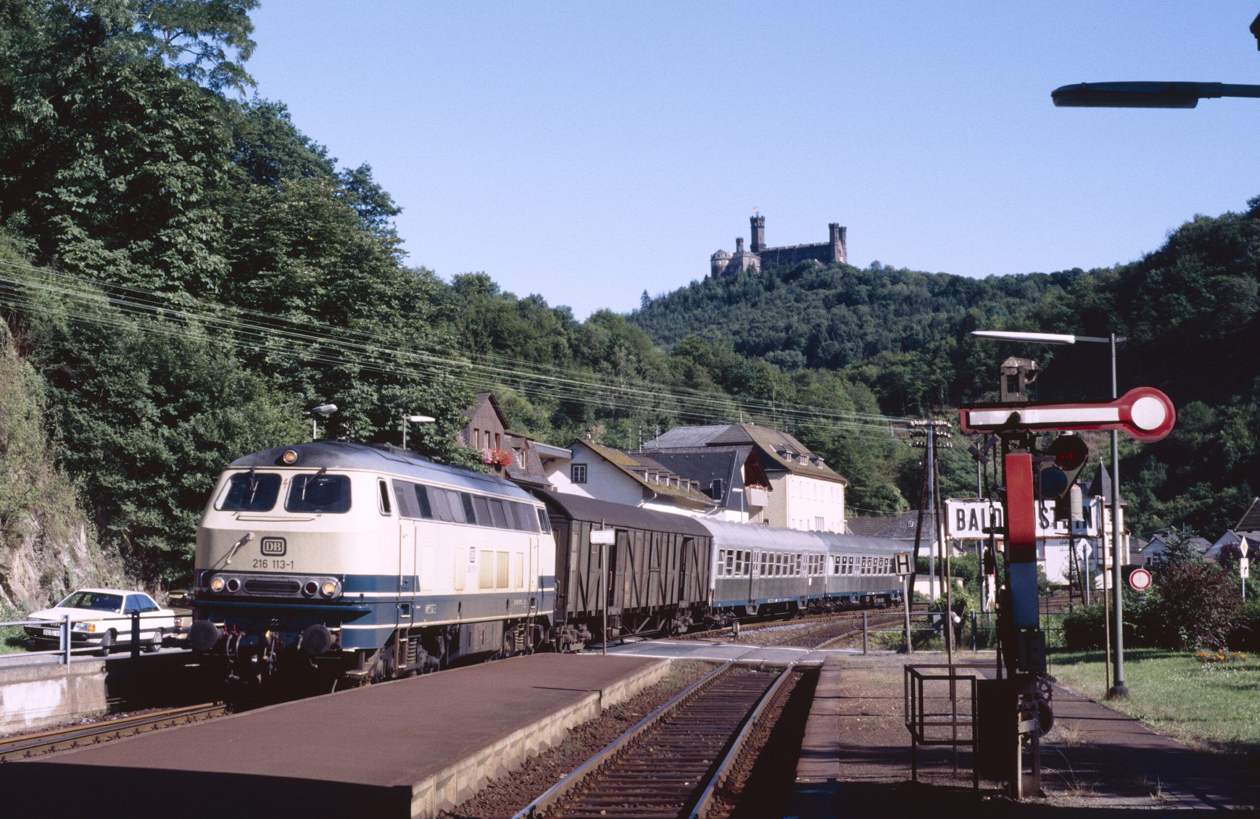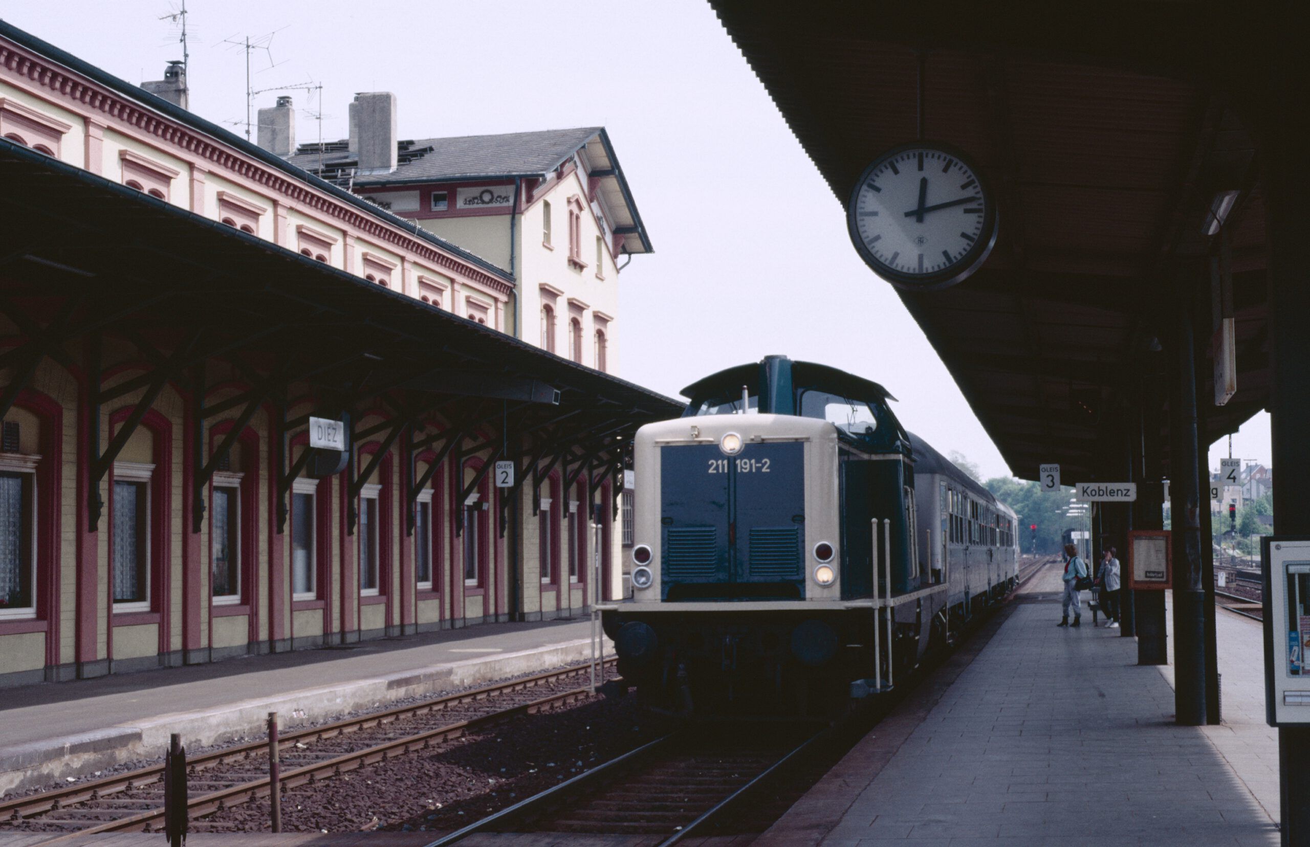 Im Lahntal waren in den 1980er Jahren recht häufig Wagenkästen alter Güterwaggons neben der Strecke aufgestellt. So auch dieser Wagenkasten vermutlich eines ehemaligen G 10-Güterwaggons neben dem Einfahr-Vorsignal von Laurenburg, an dem am 16. Mai 1988 diese dreiteilige Schienenbusgarnitur vorbei knattert