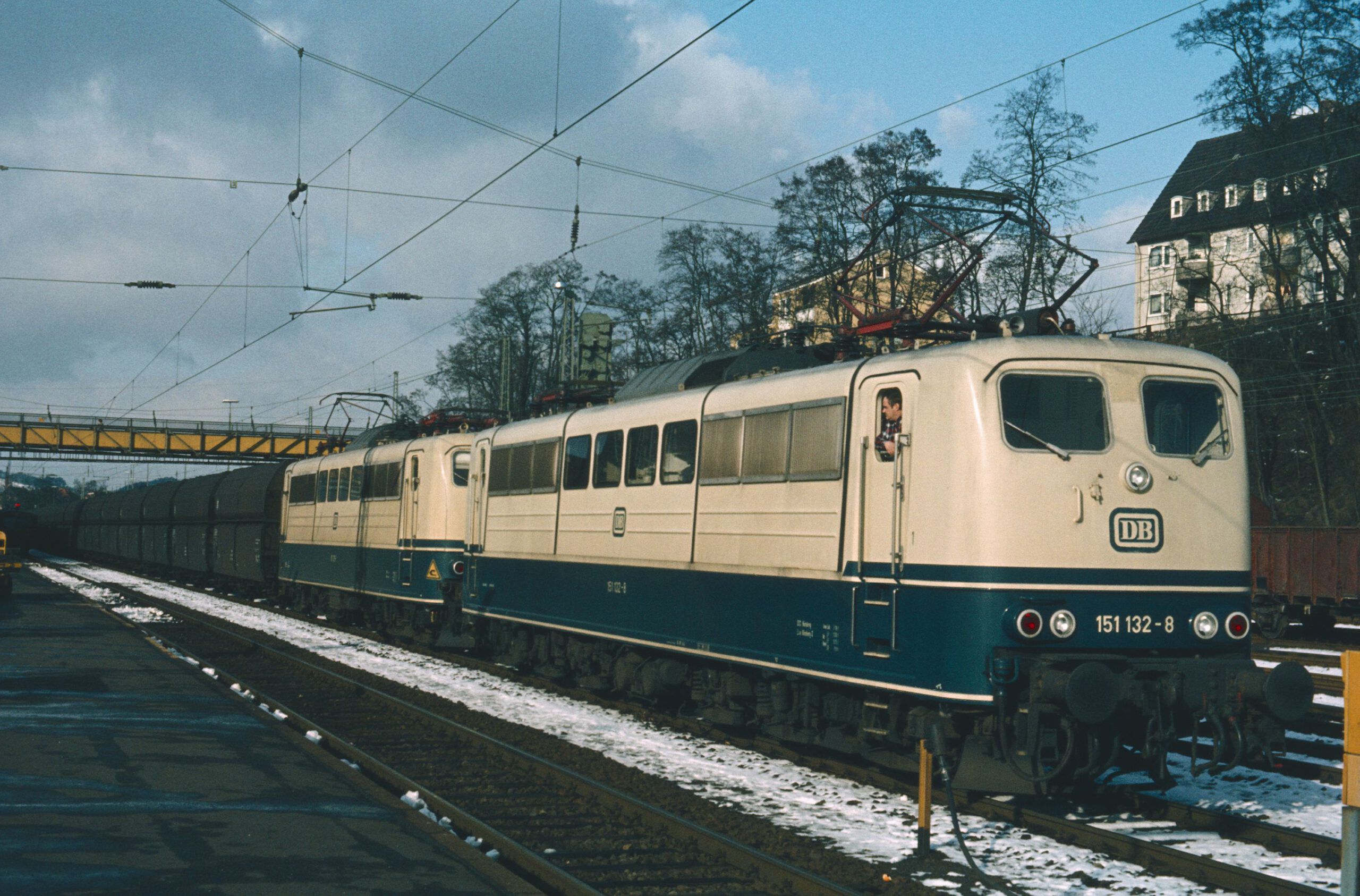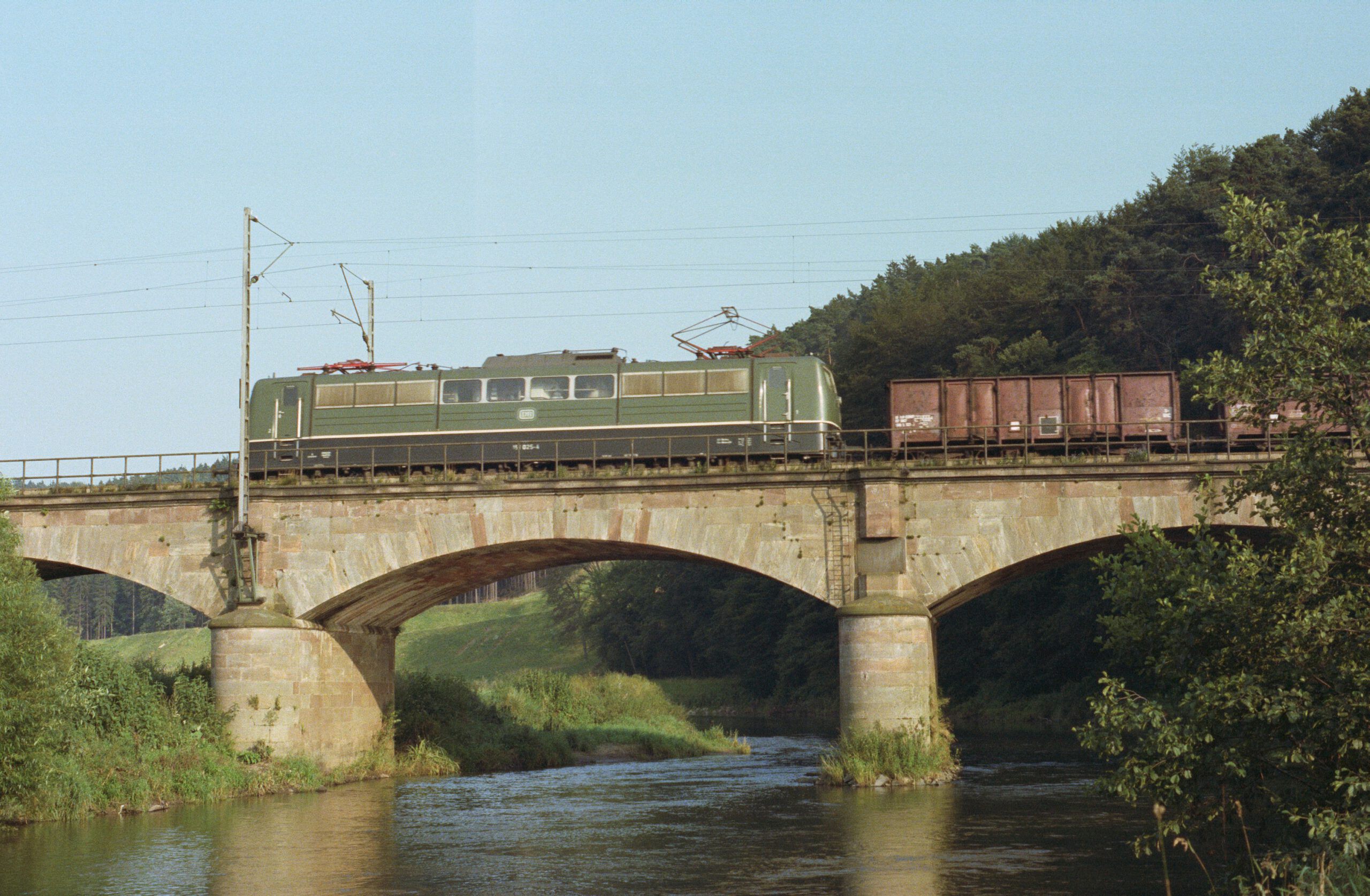 151 025 auf der Lahnbrücke bei Cölbe im Juli 1980