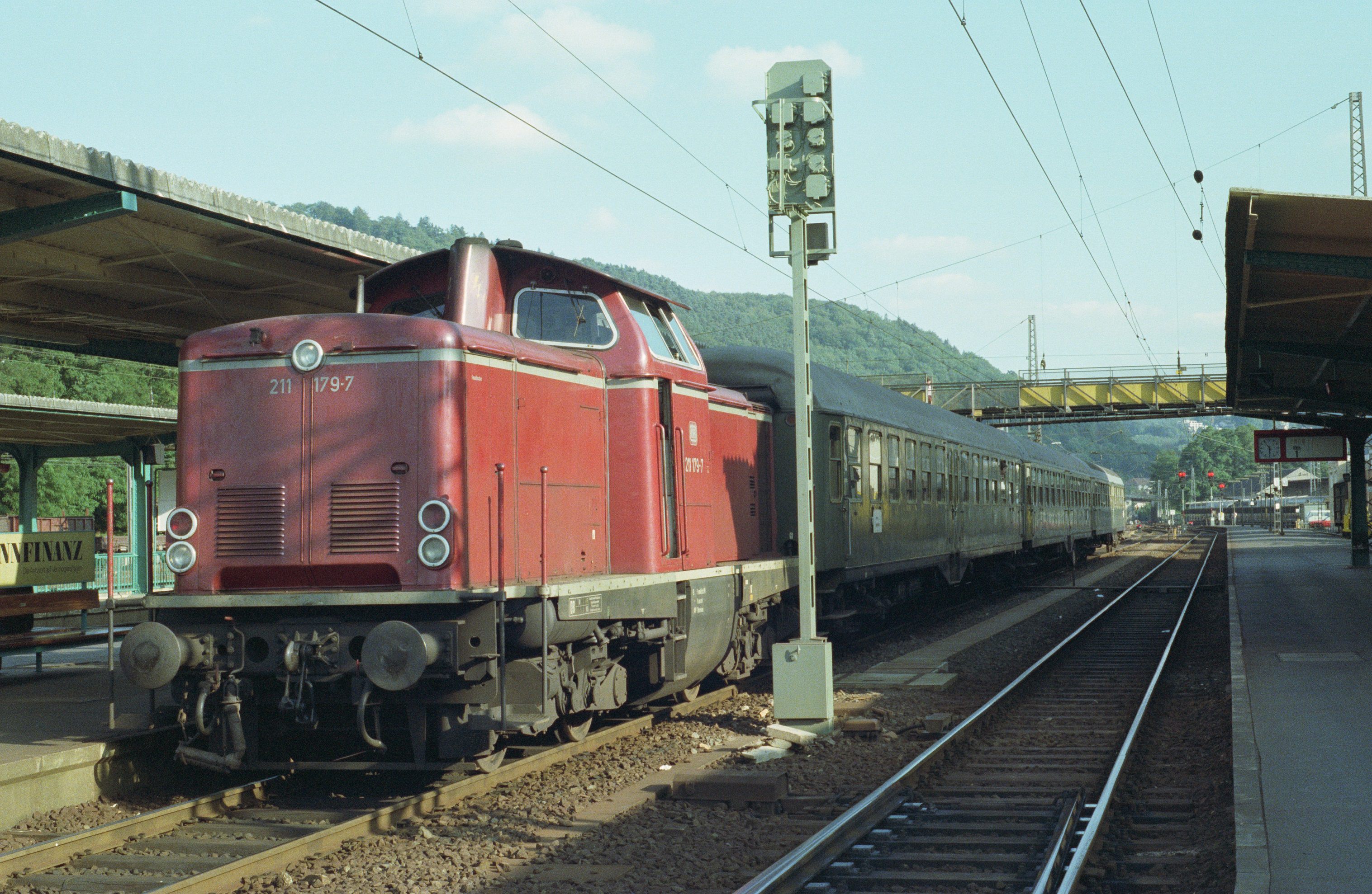 211 179 im August 1980 im Bahnhof Marburg. Der Zug fährt in Kürze in Richtung Burgwaldbahn oder obere Lahntalbahn ab