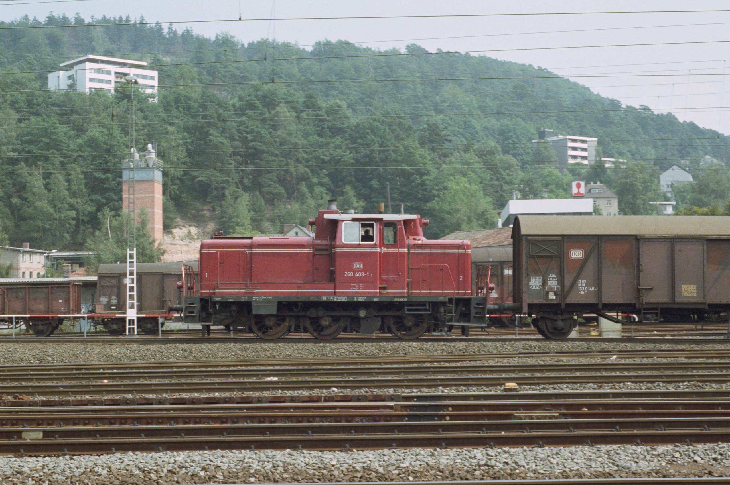 Die altrote 260 403 rangiert im Juli 1980 im Güterbahnhof
