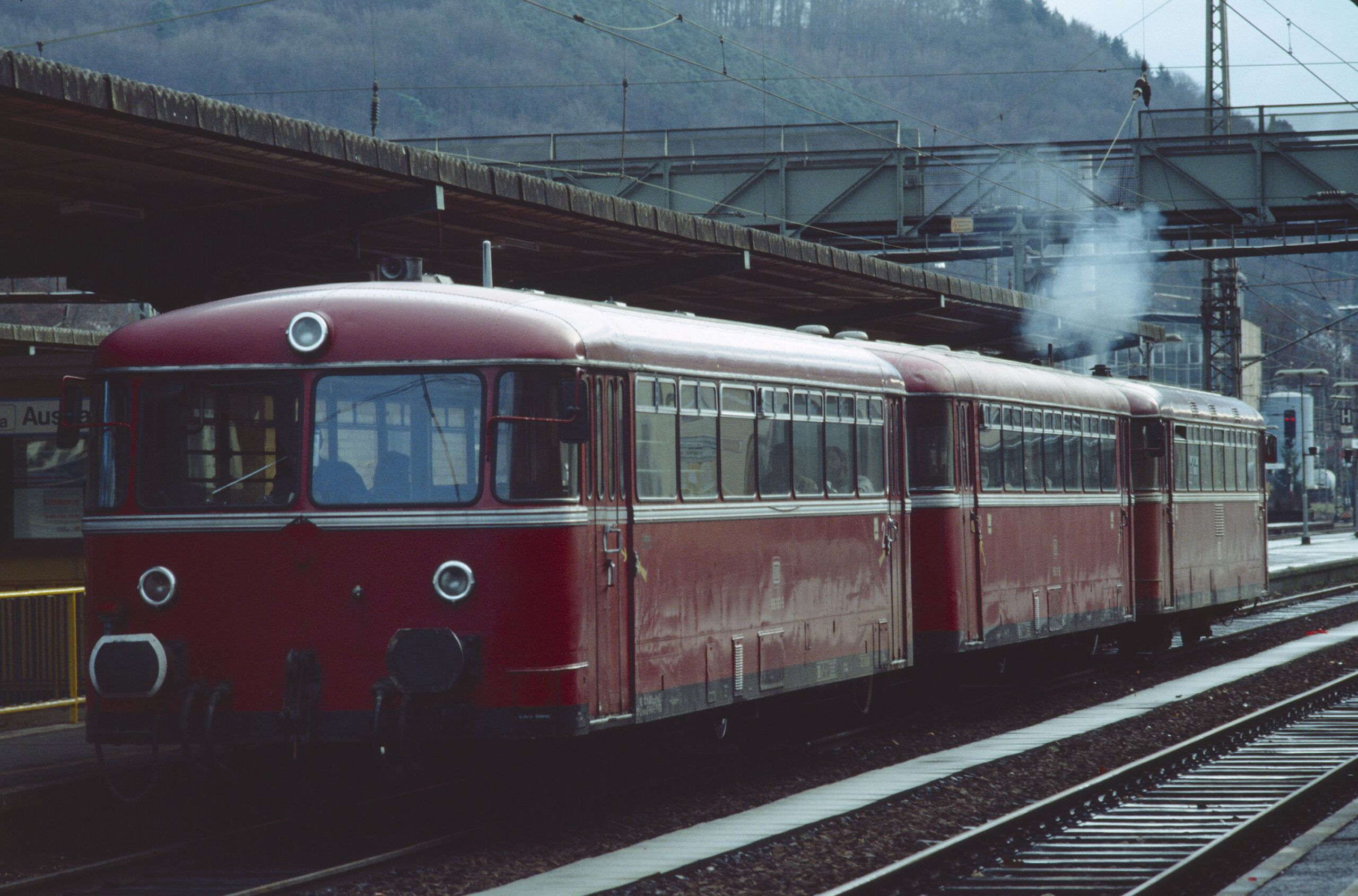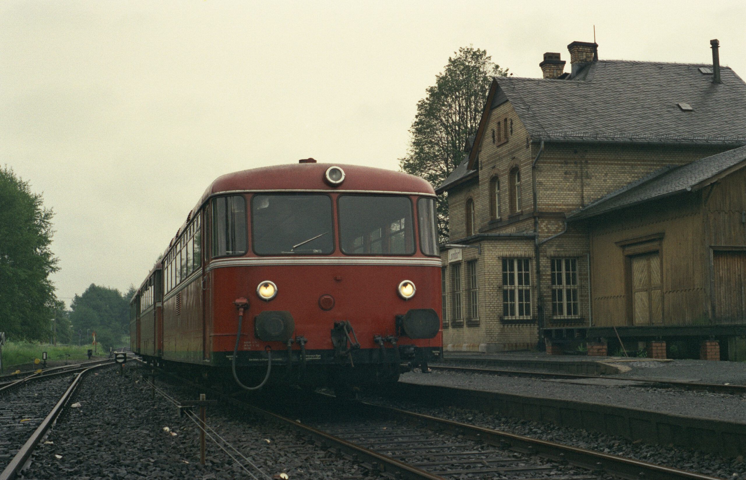 Kurz vor Einstellung des regelmäßigen Personenverkehrs gelang mir am 27. Mai 1981 die Aufnahme einer dreiteiligen Schienenbuseinheit im Bahnhof Londorf. Das Reststück der Lumdatalbahn zweigt in Lollar von der Main-Weser-Bahn ab. Die Strecke von Lollar nach Mainzlar wird noch heute im Güterverkehr befahren. Der gesamte Abschnitt zwischen Lollar und Londorf ist von der hessischen Landesregierung für eine Wiederinbetriebnahme im Reisezugverkehr vorgesehen