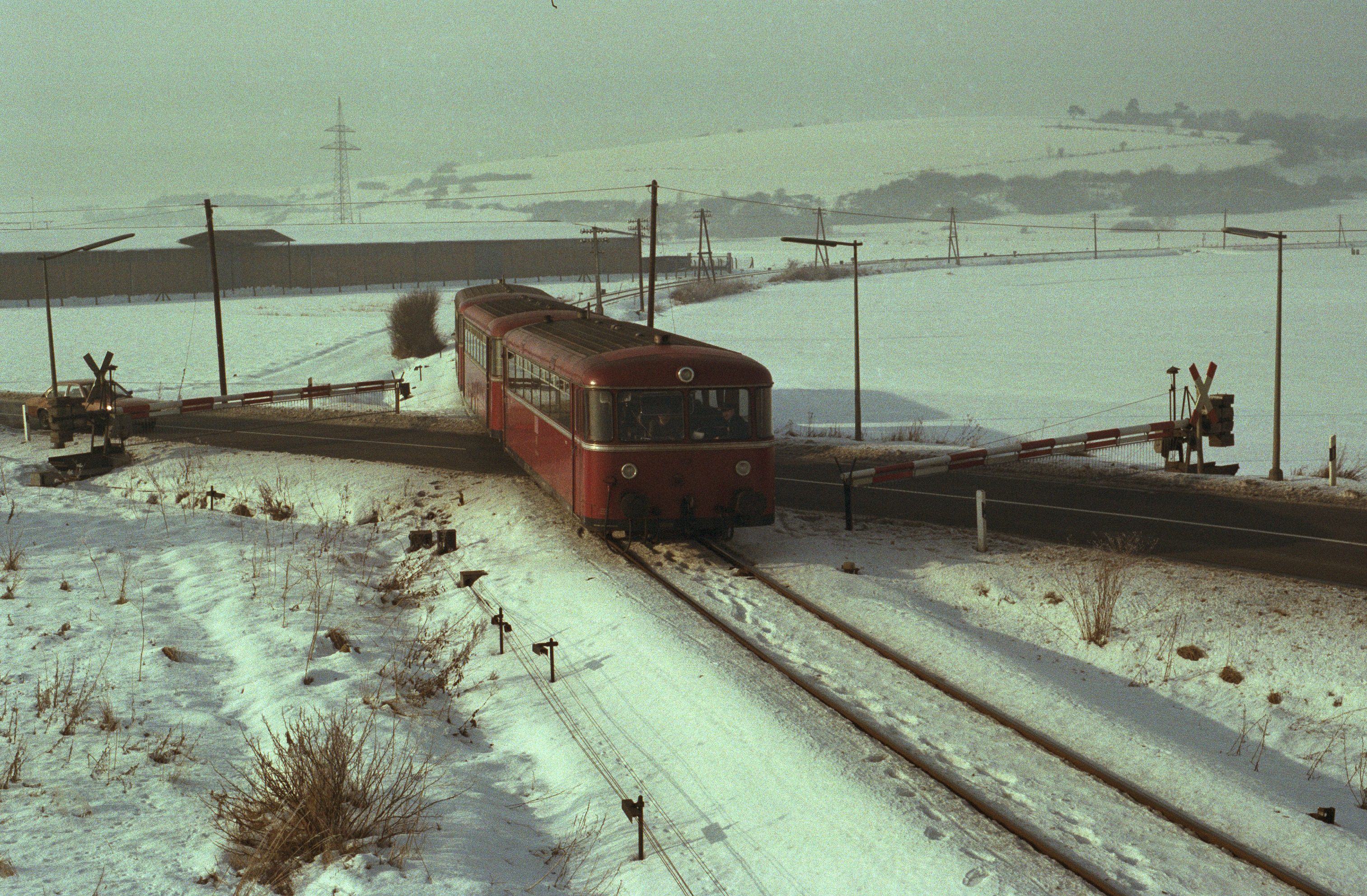 Schienenbus auf dem Weg von Frankenberg nach Marburg (Burgwaldbahn). Blick aus dem Stellwerk in Sarnau im Januar 1981. Heute ist das Stellwerk verschwunden und die Landschaft hat sich durch den Bau einer Umgehungsstraße grundlegend verändert.