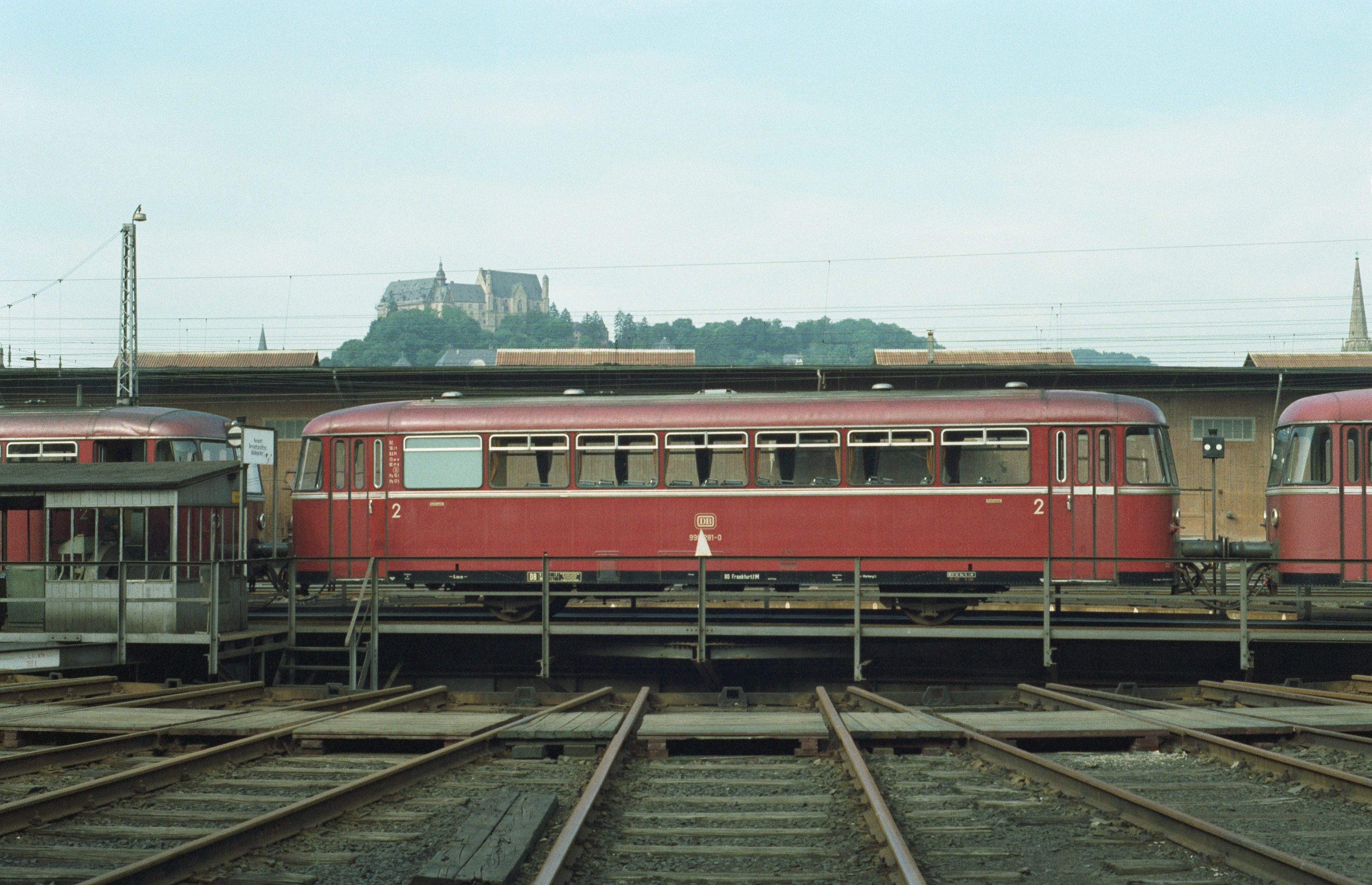 Ein Schienenbusbeiwagen fährt im Schienebusverband über die die Drehscheibe des Bw Marburg. Im Hintergrund thront das Marburger Schloss. Die Aufnahme entstand im Sommer 1980