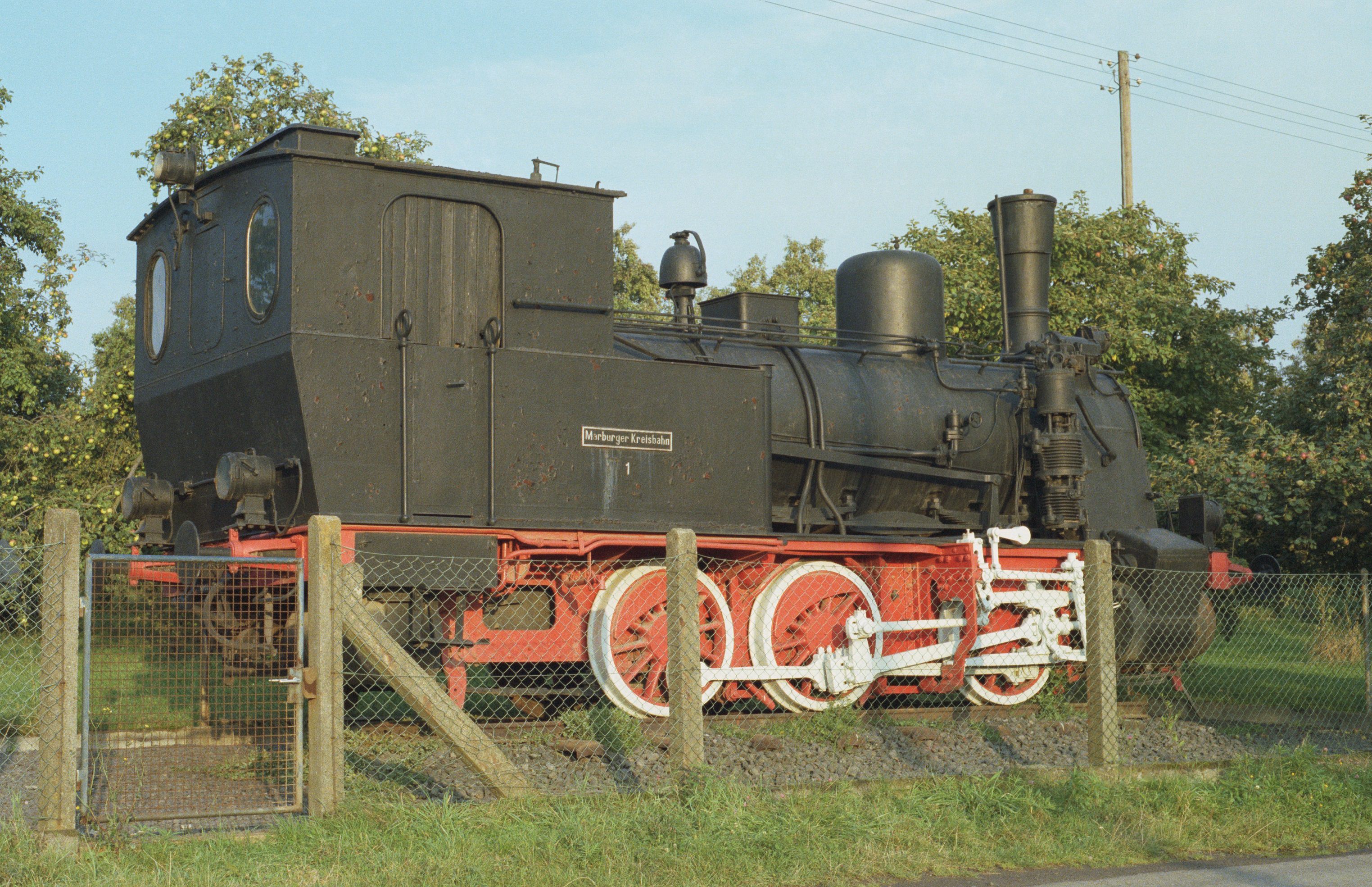 Lok Nr. 1 der Marburger Kreisbahn auf dem Denkmalsockel in Dreihausen. Jahre später wurde die Lok von den Eisenbahnfreunden Wetterau vom Denkmalsockel geholt und betriebsfähig aufgearbeitet