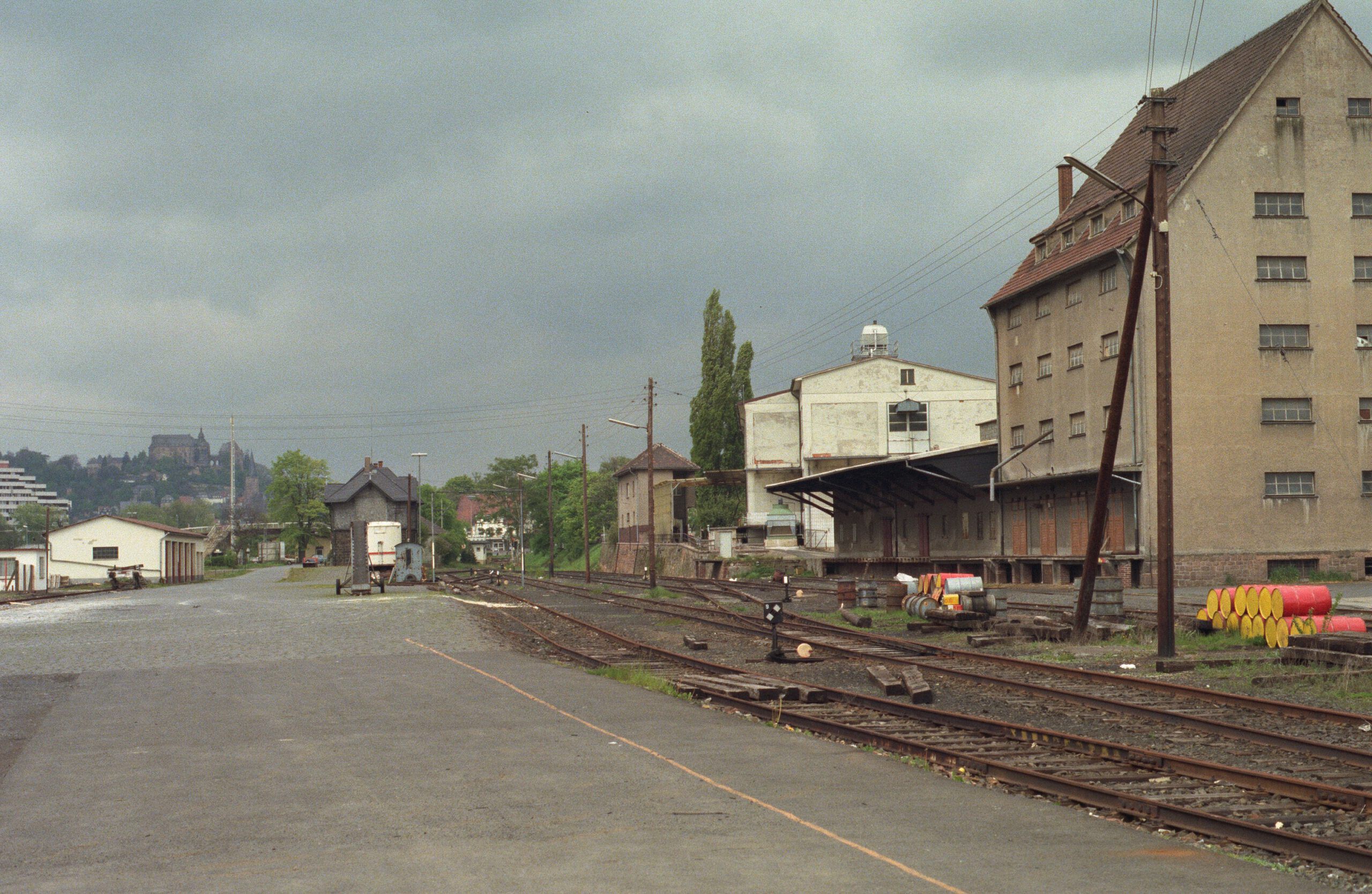 Im Mai 1981 konnte man hinter dem Haltepunkt Marburg-Süd noch die Reste der Marburger Kreisbahn erforschen. Das graue Haus links von der Bildmitte war das Direktionsgebäude