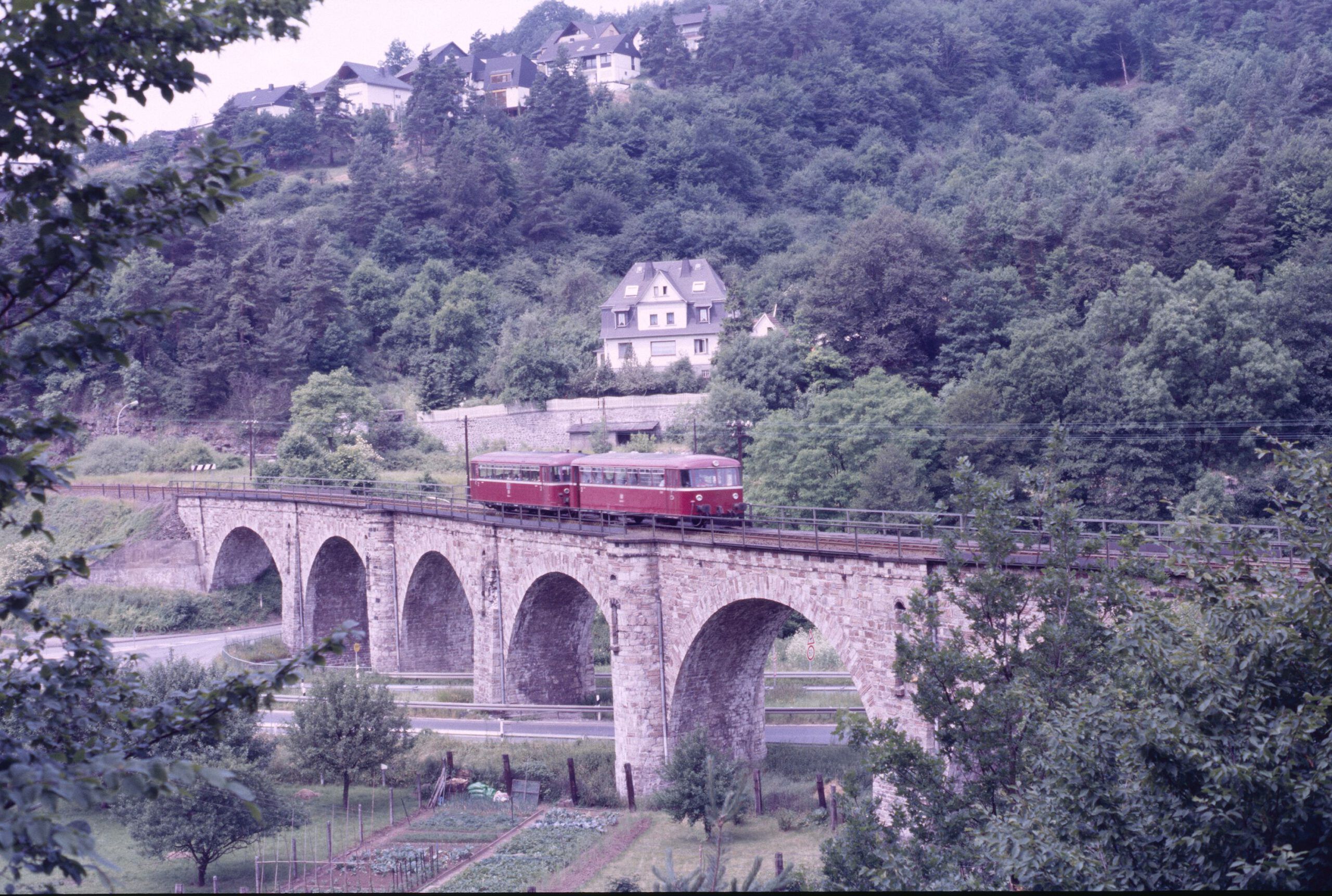 Zweiteilige Schienenbuseinheit auf dem Niederschelder Viadukt der Scheldebahn (Dillenburg -Wallau) am 12. Juli 1984