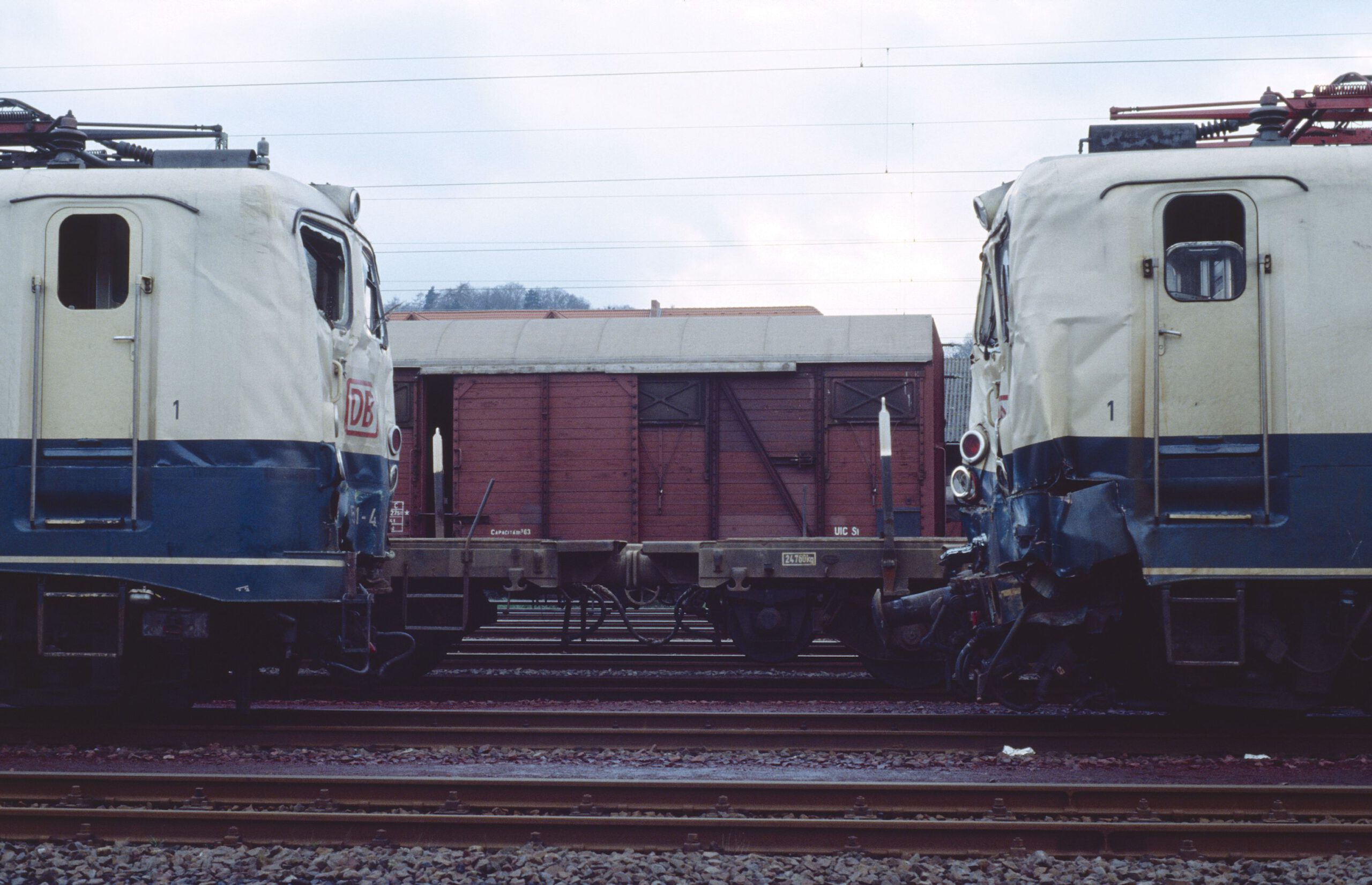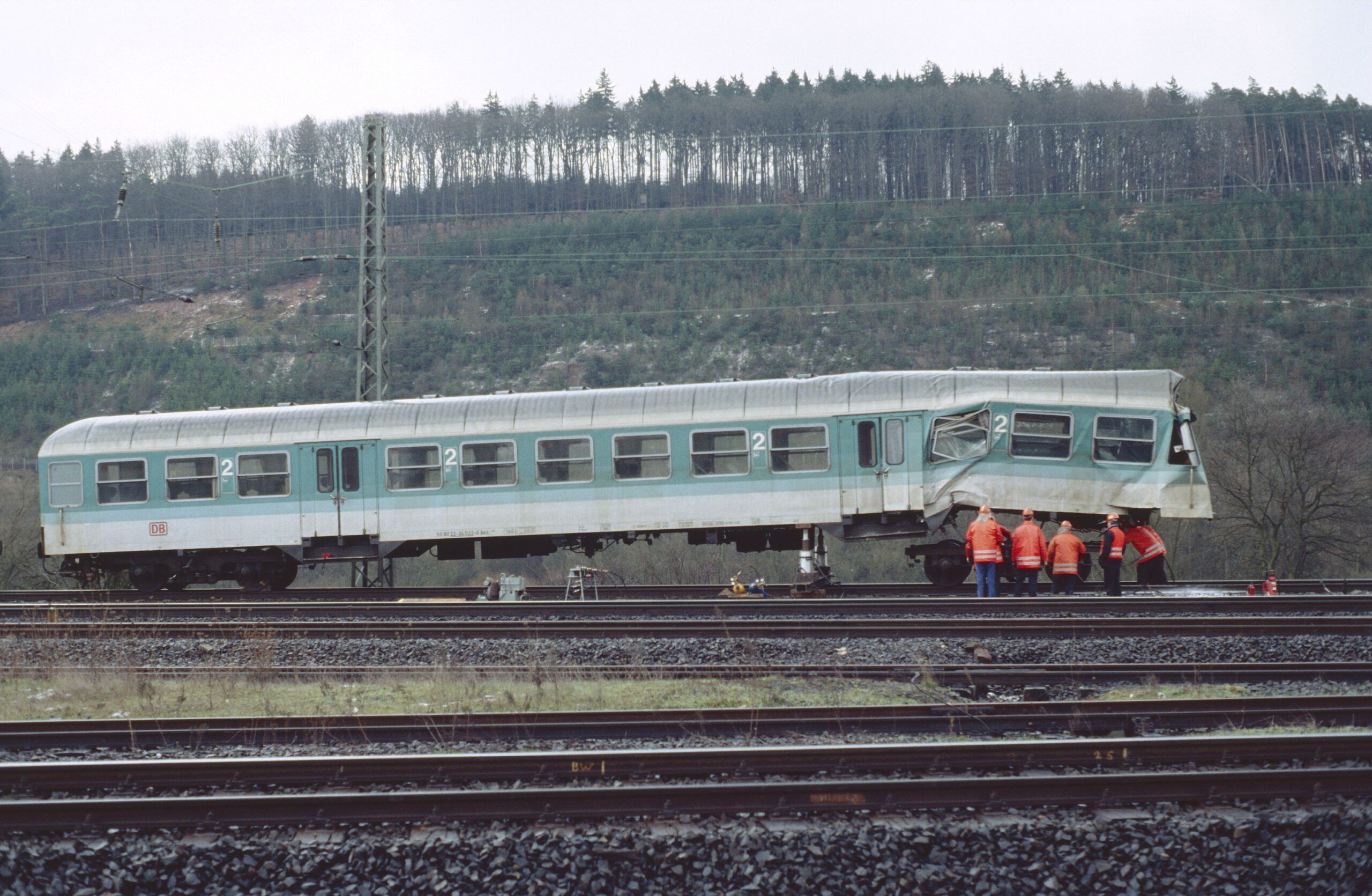 Im Januar 1995 kam es zu einem Auffahrunfall im Bahnhof Cölbe. Beteiligt waren die Lokomotiven 140 541 und 141 165. Die 140 wurde im Februar 1996 und die 141 im Mai 1995 z-gestellt. Auf dem Foto vom 21. Januar 1995 wird der Reisezugwagen zum Abtransport vorbereitet. Die beteiligten Lokomotiven standen zu diesem Zeitpunkt schon im Bahnhof Marburg