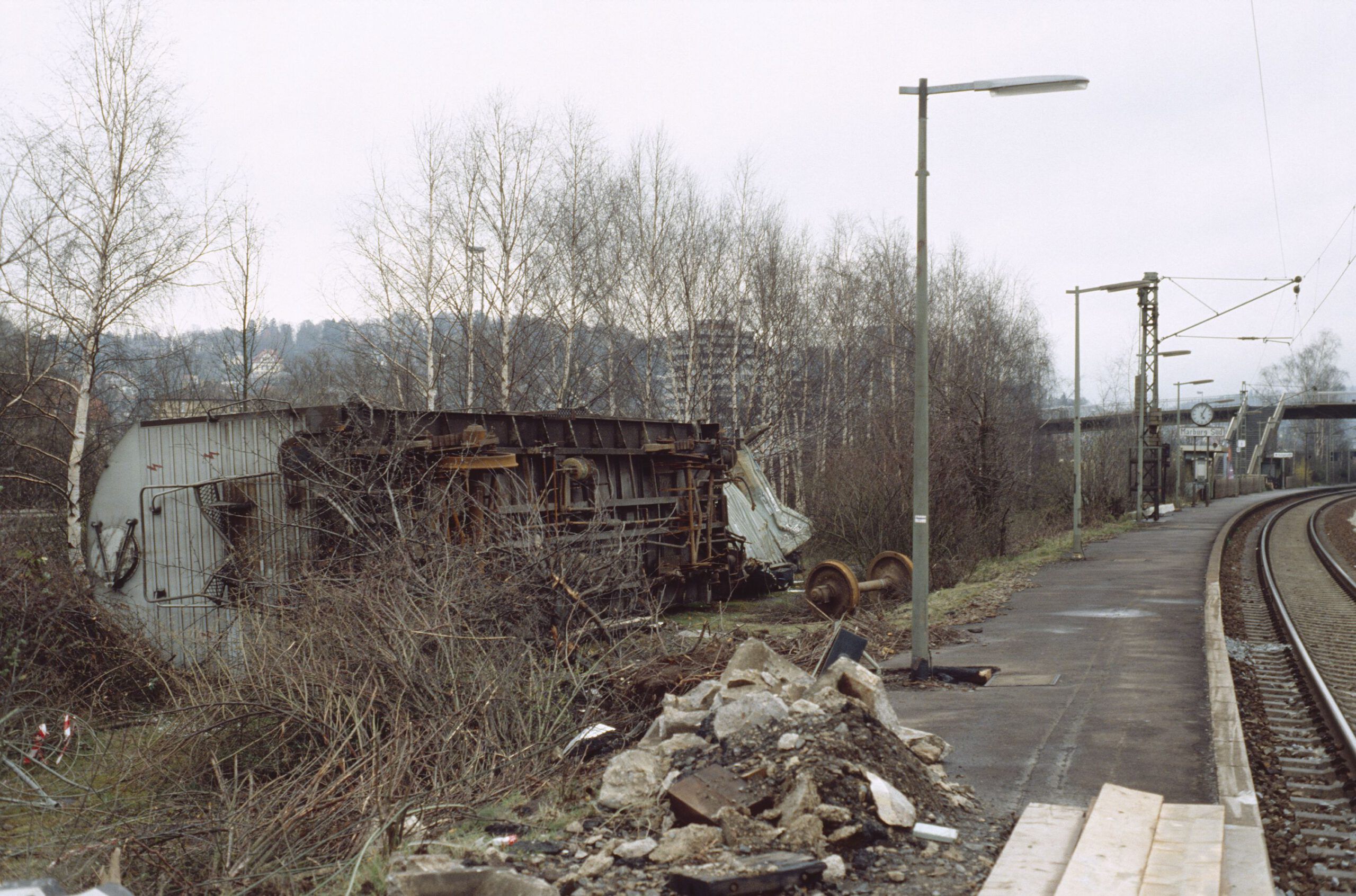 Ein weiterer Unfall ereignete sich in Marburg-Süd, Aufnahme vom 01. April 1995. Wie der Güterwaggon ins Gebüsch gelangte, ist mir nicht bekannt