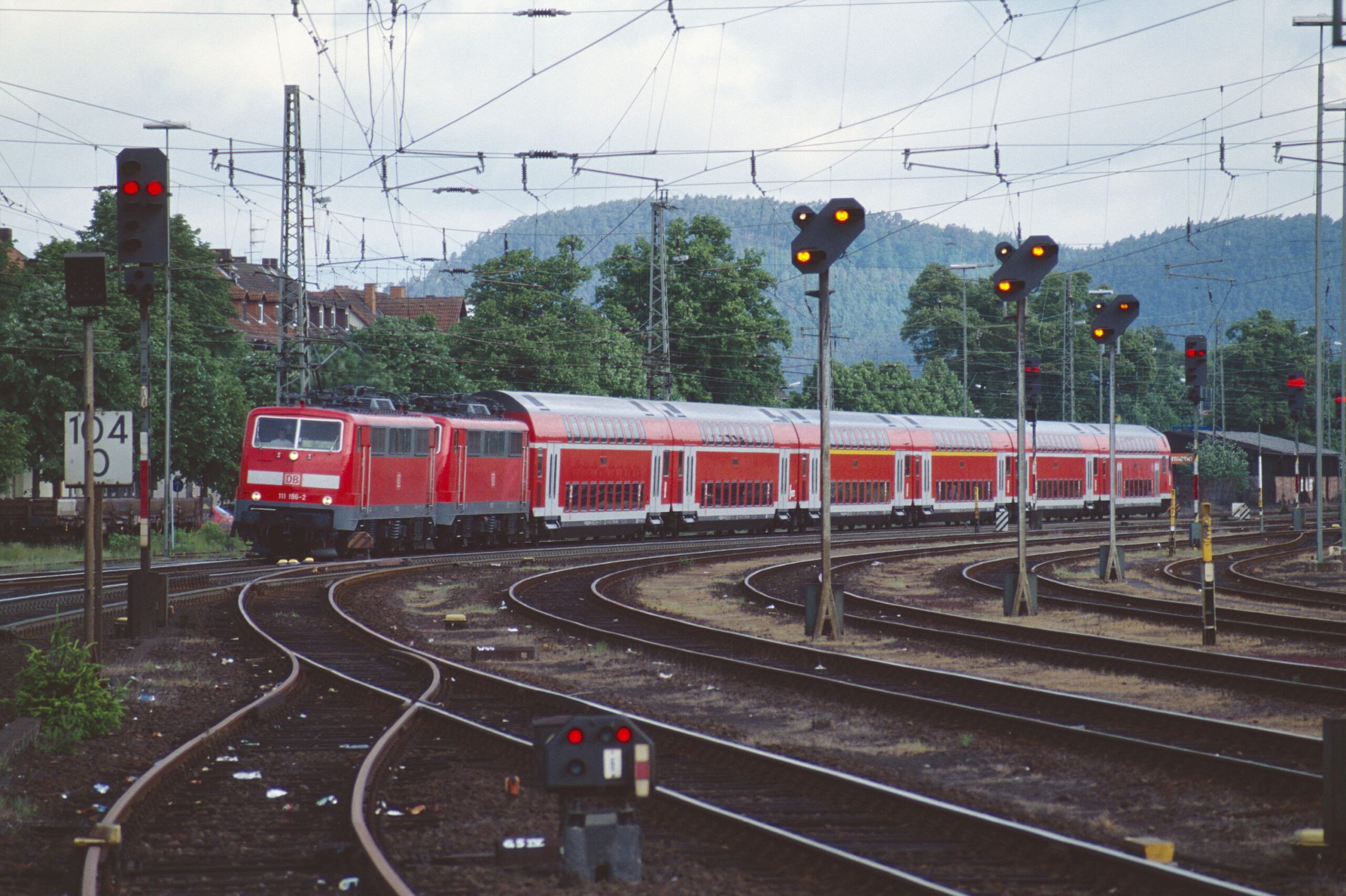 111 196 und eine weitere 111 am 29. Mai 2002 bei der Einfahrt in den Bahnhof Marburg aus Richtung Norden