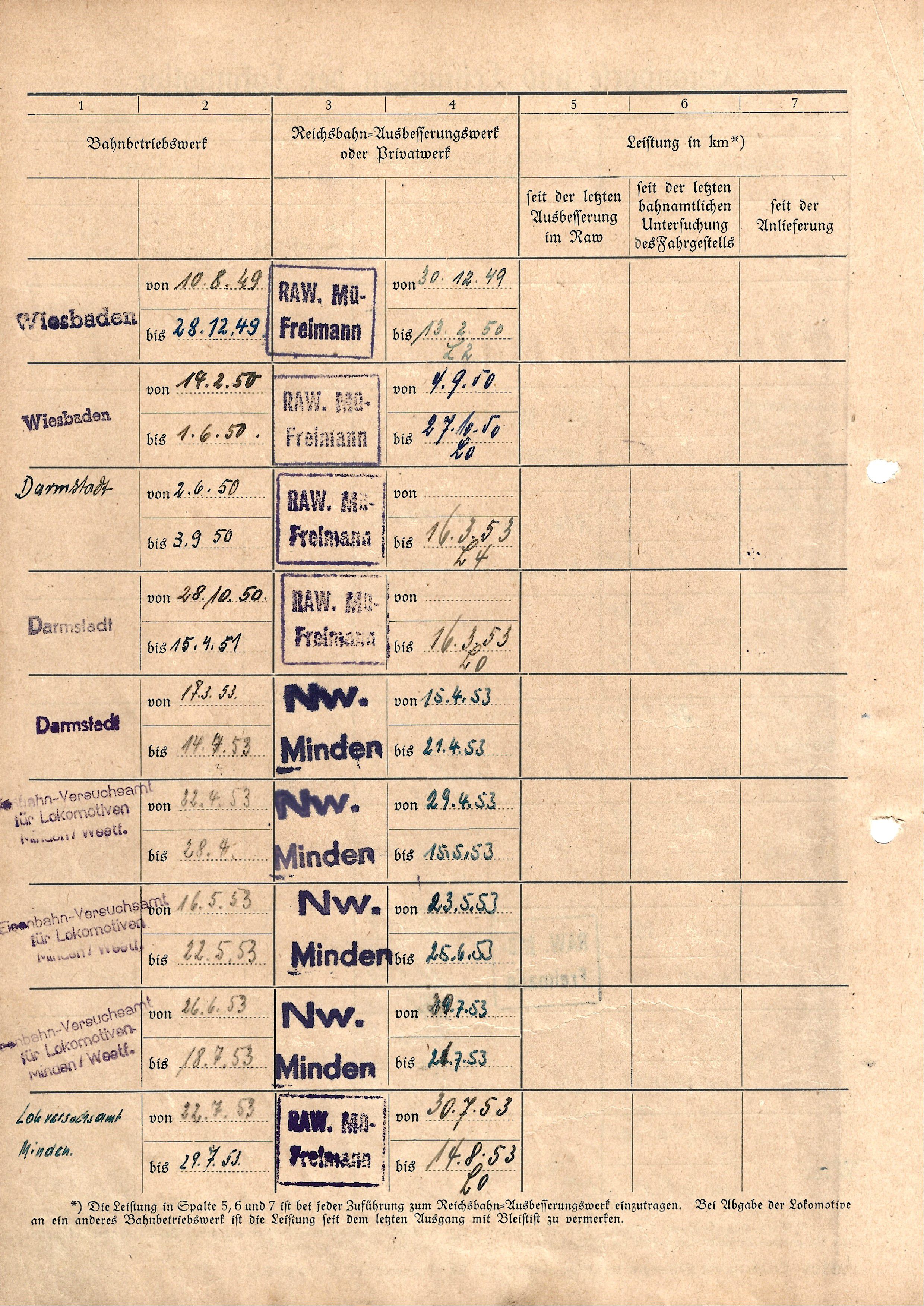 Betriebsbögen der Wiesbadener 89 7271 von 1948-1954. Mit einer Monatslaufleistung von 3831 km erbrachte diese kleine Lok im Dezember 1954 eine beträchtliche Monatlaufleistung! Die ehemalige preußische T 3 war die letzte Lok der Gattung in Wiesbaden und wurde nach deren Ausmusterung durch drei bayerische R 3/3 ersetzt. Eine der drei Loks, die 89 650 war bis zum 09. März 1960 in Wiesbaden im Einsatz