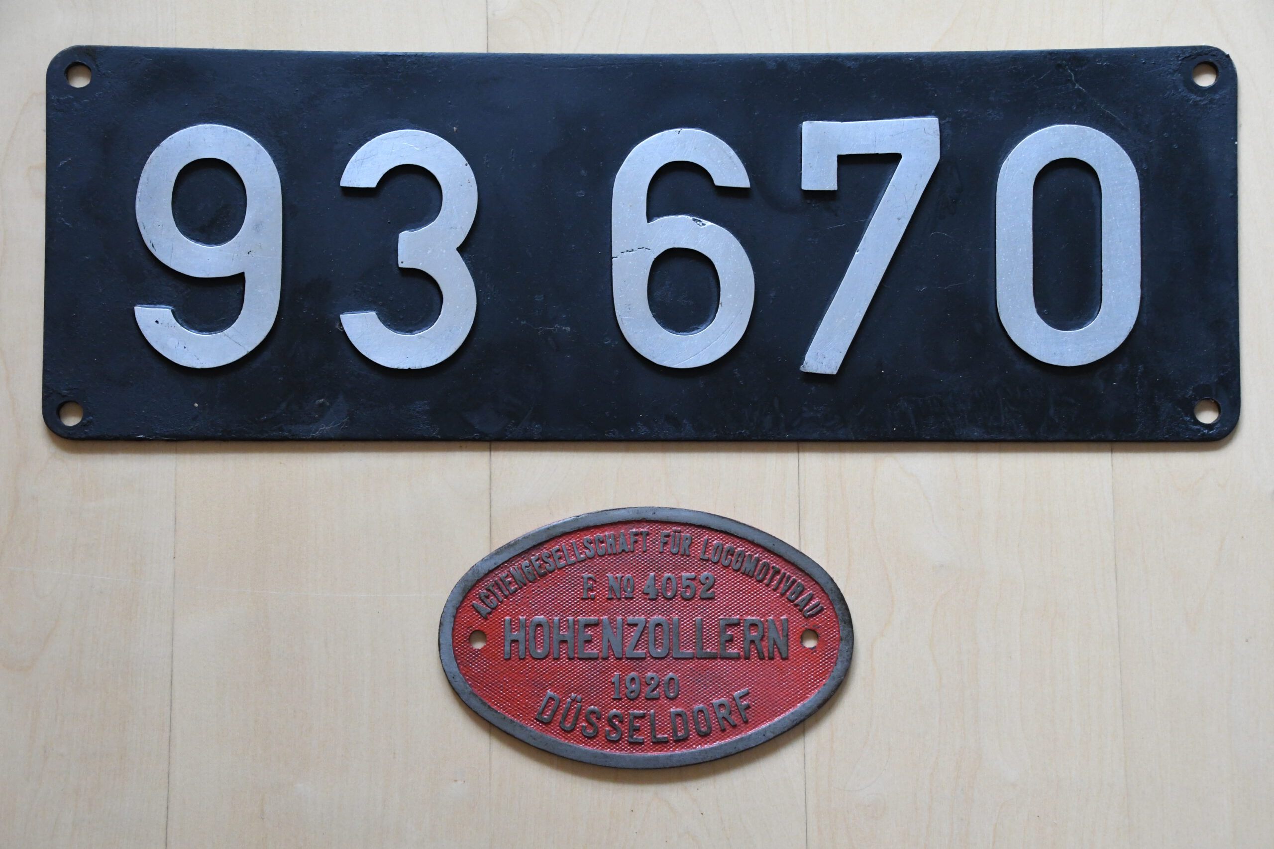 Lok- und Fabrikschild der 93 670. Die Lok war lange in Wiesbaden und Limburg beheimatet und befuhr häufig die Aartalbahn. Der bekannte Wiesbadener Fotograf Hans Scheffler fotografierte die Lok bei der Einfahrt am Haltepunkt Waldstraße in Wiesbaden. Auf dem Foto ist das Frontschild mit der sehr gut erkennbaren größere "7" zu erkennen.
