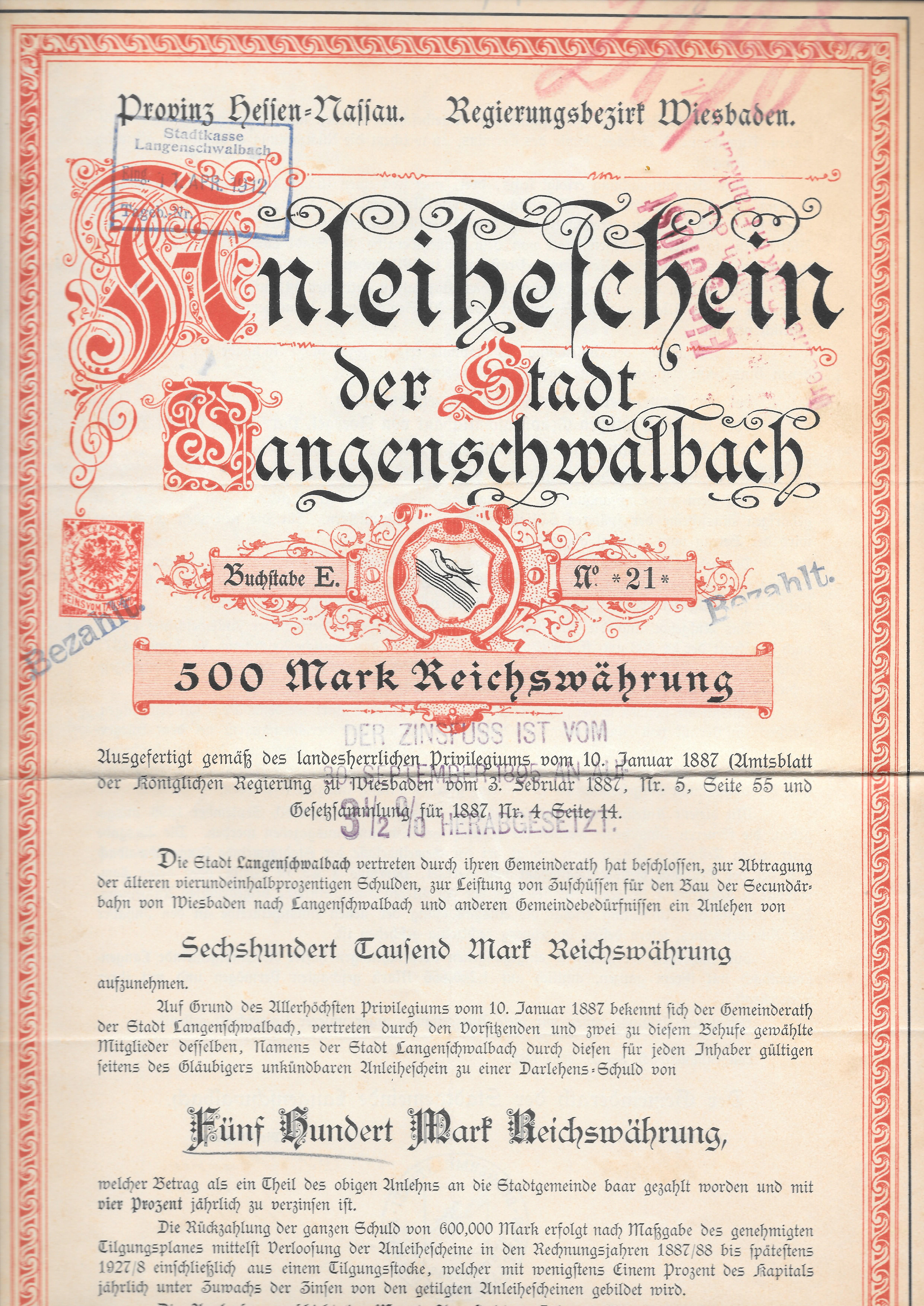 Anleiheschein der Stadt Langenschwalbch (heute Bad Schwalbach) u.a. ..."zur Leistung von Zuschüssen für den Bau der Secundärbahn von Wiesbaden nach Langenschwalbach"...