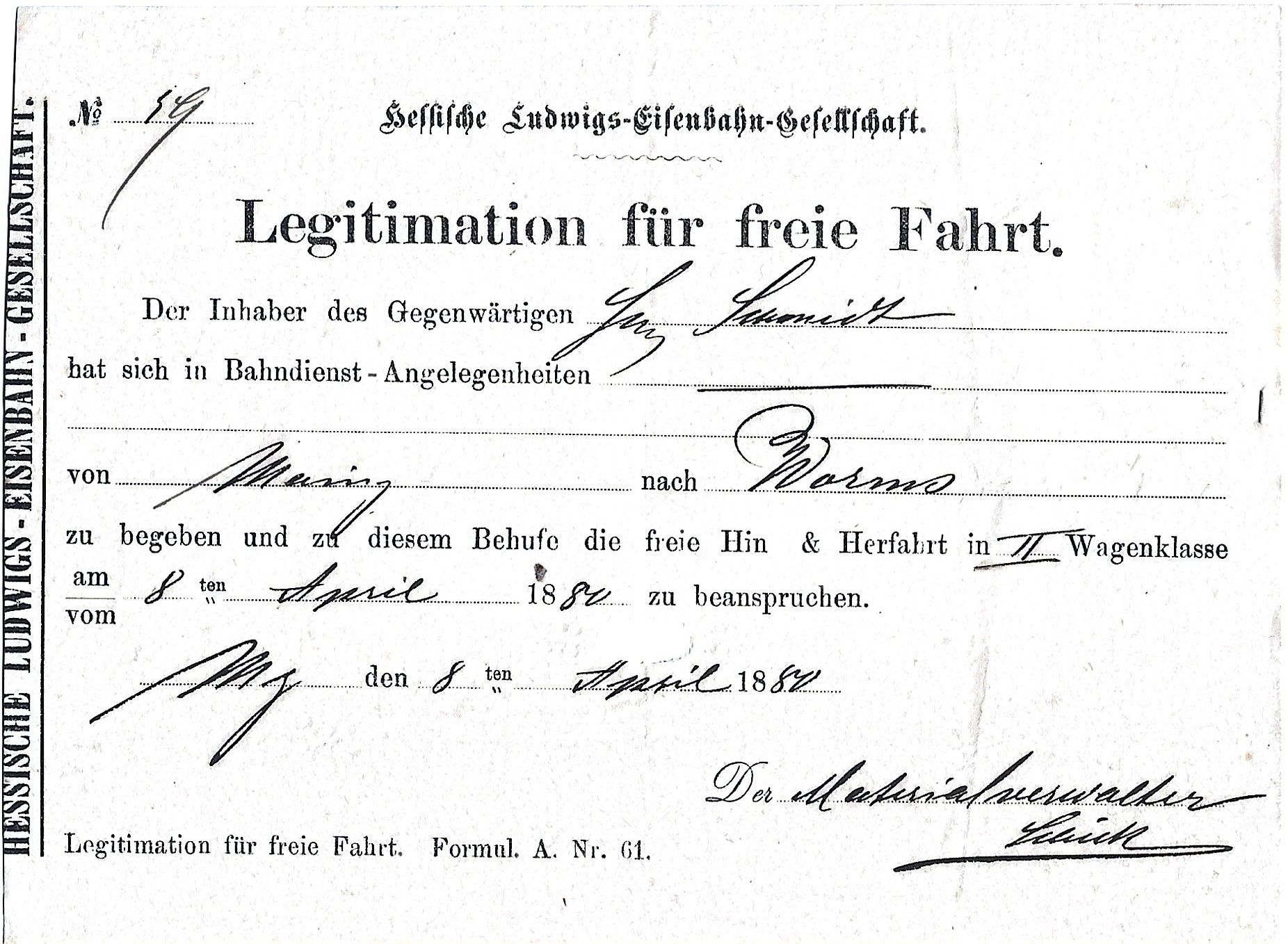 Jacob Schmidt arbeitete 1880 als Calculator bei Hauptmagazinverwaltung der Hessischen Ludwigseisenbahn-Gesellschaft in Mainz. Als Bahnmitarbeiter erhielt er diese Freifahrkarte. Die Fahrt begann nicht am heutigen Hauptbahnhof, sondern am bis 1884 genutzten Rheinbahnhof