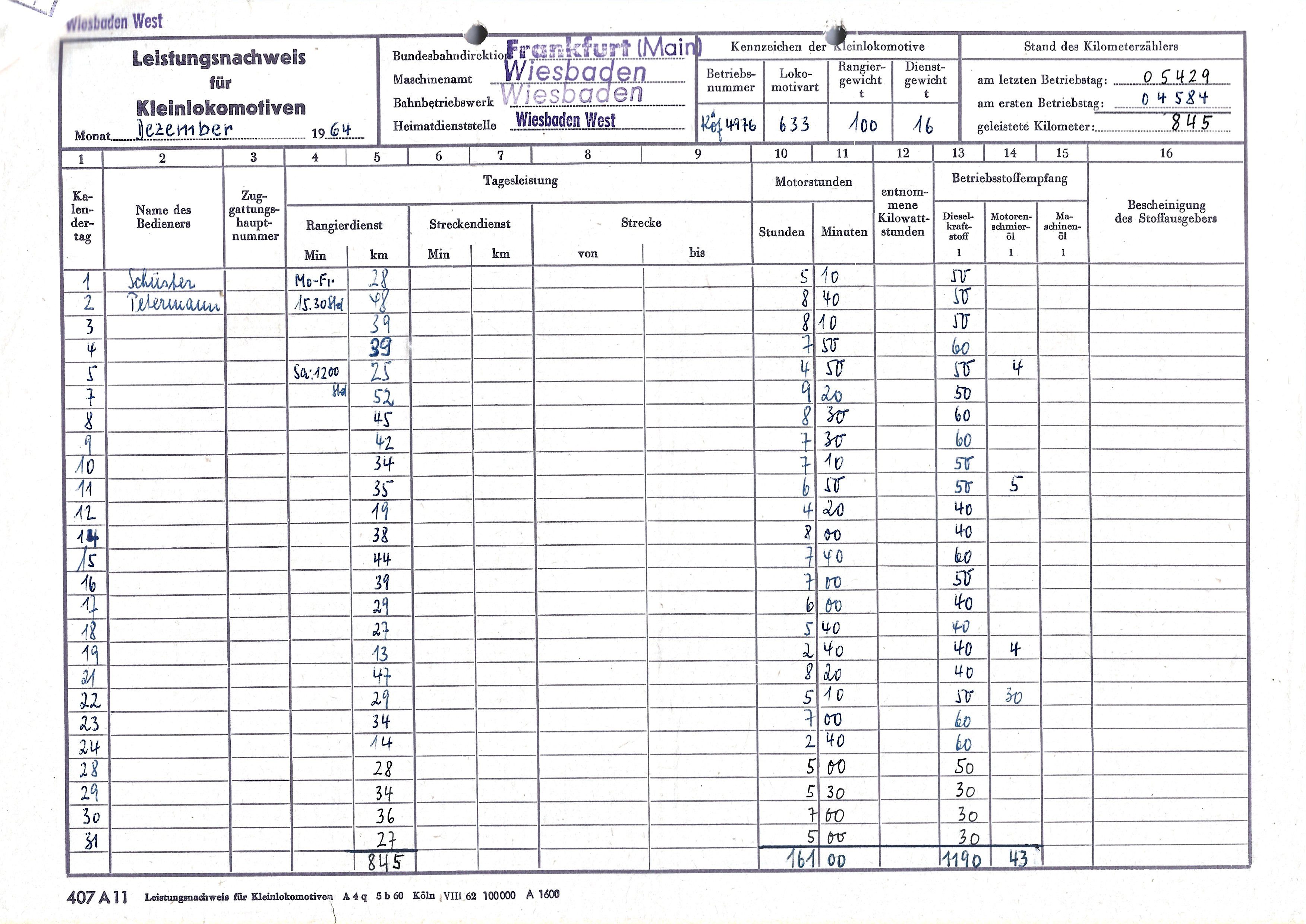 1964 waren Wiesbaden-West, Wiesbaden-Ost, Mainz-Kastel, Biebrich und Erbenheim Kleinlokomotiven zugewiesen. Alle Lokomotiven waren im Bw Wiesbaden beheimatet. Köf 4976, die spätere 322 178-5, war im Dezember in Wiesbaden-West eingesetzt
