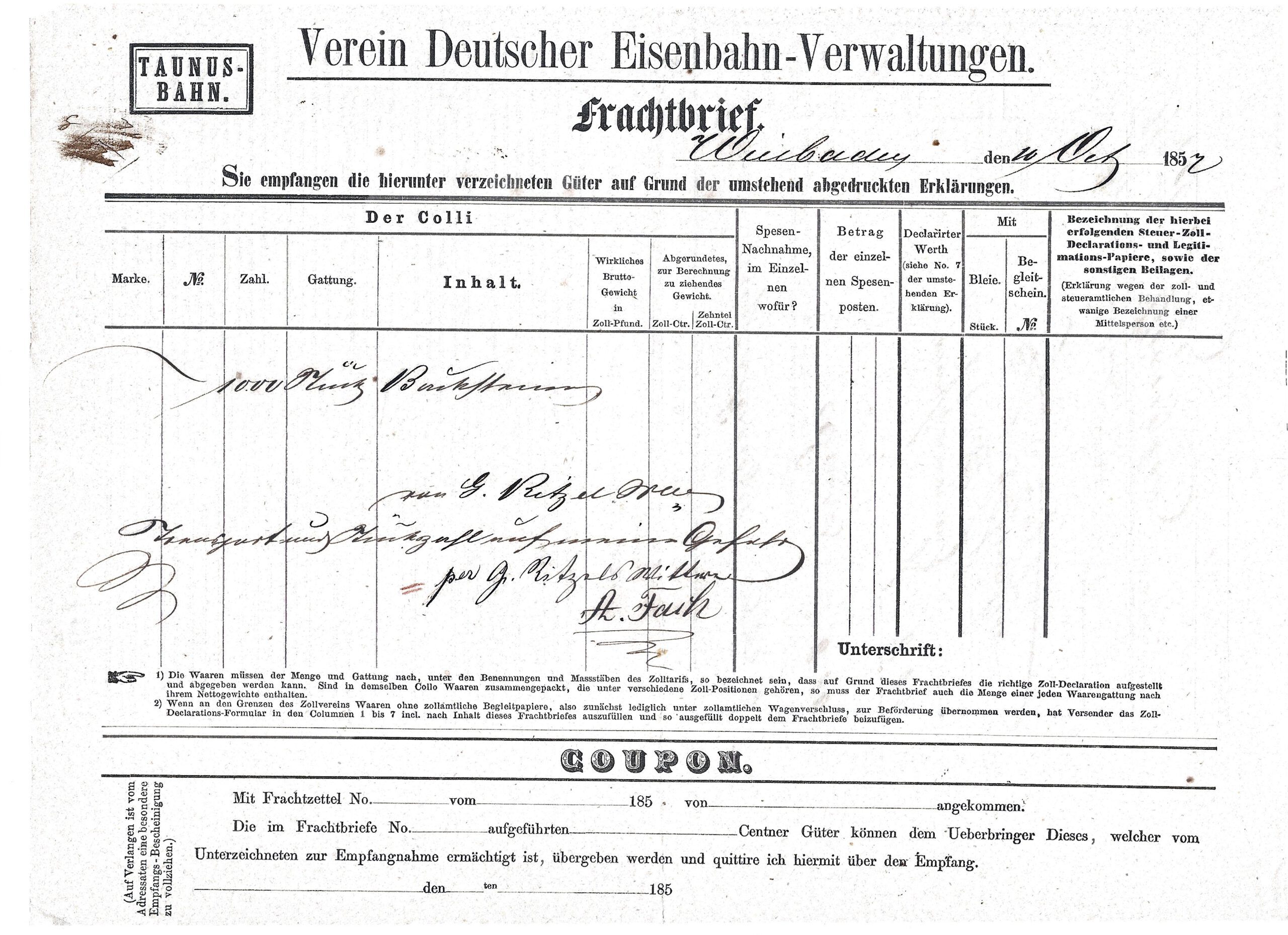 Frachtbrief der 17 Jahre jungen Taunusbahn, ausgestellt am 16. Dezember 1857 in Wiesbaden zum Transport von "1000 Stück Backsteine". Weiterhin ist die Bemerkung "Transport und Rückgabe auf meine Gefahr" auf dem Frachtbrief zu lesen